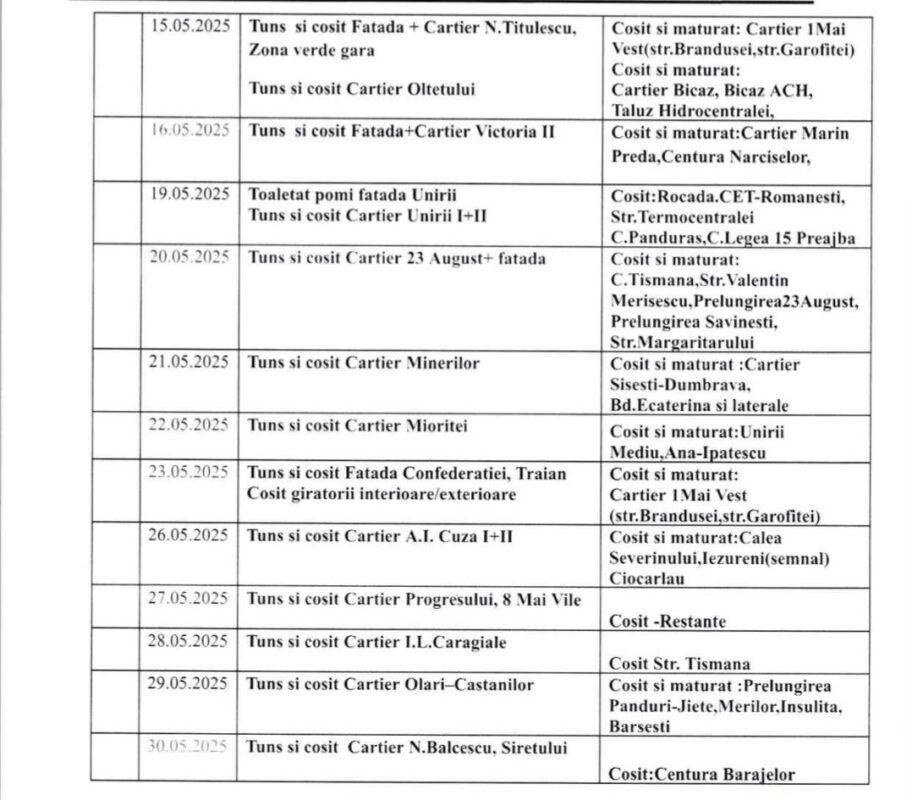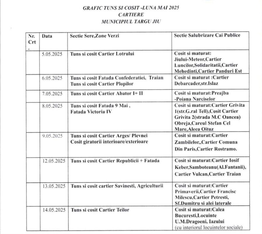 „Reamintim că activitățile de tuns și cosit în Municipiul Târgu Jiu se desfășoară conform graficului anunțat. În acest sens, facem un apel către cetățeni să sprijine echipele noastre din teren, eliberând de autovehicule zonele în care urmează să se intervină.