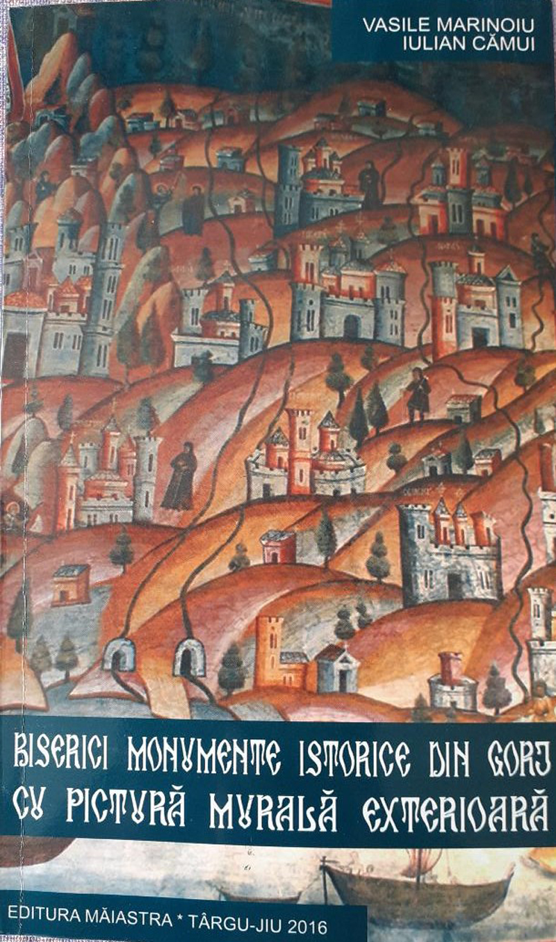 Întâmplarea fericită a avut loc sub sigla editurii Măiastra, cartea ieșind spectaculos de sub teascurile Tipografiei ProdCom, susținută logistic și financiar de Muzeul Județean în anul… 2016. Și noi care aveam pretenția că știm multe… Mai bine mai târziu decât niciodată, zice o vorbă din bătrâni care ne absolvă de ipocrizie, ba chiar și de ignoranță de cele mai multe ori, amânând cu diplomatică distanță, căderea într-un ușor ridicol împreunat fără meșteșug și cu niscai… iluzii deșarte. Povestea e bine să fie cunoscută de toată lumea. La Muzeul nostru a ajuns pe simeze, în cadrul unor „schimburi culturale” la care am fost și parteneri, o expoziție itinerantă despre bisericile cu pictură murală exterioară din toată Oltenia și cum s-a constatat că județul Gorj era insuficient reprezentat și cu omisiuni impardonabile referitoare la numărul monumentelor istorice, la programul lor iconografic, la datarea greșită a unora dintre ele sau la atribuirea unor autori neconfirmați sau greșit menționați pentru prea multe dintre picturile de zid exterioare, Vasile Marinoiu și arh. Iulian Cămui s-au ambiționat și au elaborat o lucrare cu pretenții științifice, care să dea dreapta măsură despre ceea ce înseamnă pictura murală exterioară pentru arta bisericească din arealul gorjenesc prin comparație și/sau contextualizat cu întreaga artă medievală românească. Așa am aflat că la începutul sec. XX, în Oltenia erau atestate documentar ca monumente istorice cam 145 de biserici de zid cu pictură exterioară și că dintre acestea mai mult de o treime aparțineau județului Gorj. Astăzi din cele rămase, jumătate sunt ale noastre și 24 dintre ele păstrează pictura exterioară „in integrum”, iar alte 16 au rămas doar cu pictura din pridvor.
