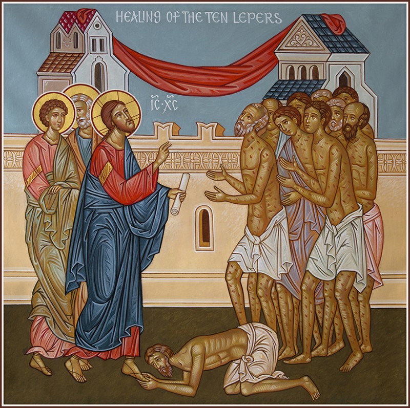 Pericopa aceasta ilustrează foarte bine, credem noi, mesajul Evangheliei cu cei zece leproşi, având ca temă principală recunoştinţa, o «rara avis», am spune, poate chiar o “floare rară“, cum se zice în popor, pentru că multe lucrări teologice sau laice abordează tema recunoştinţei. În aceste rânduri, ne propunem să analizăm minunea săvârşită de Mântuitorul, inclusiv raportul binefacere-recunoştinţă, într-un plan mai larg, propriu-zis, în contextul operei de mântuire a neamului omenesc. Pentru început, amintim, totuşi, că vindecarea leproşilor a fost un gest concret al milei Mântuitorului, făcut pentru aceşti zece nefericiţi, purtători ai unei boli incurabile, care măcina trupul până la suprimarea vieţii. Trebuie să observăm că Iisus Hristos şi-a manifestat compasiunea spontan și n-a mai întrebat, ca în alte situaţii: «Credeţi că pot să fac aceasta?», ci, i-a trimis direct să fie văzuţi de preoţi, pentru a li se certifica vindecarea. Se ştie că lepra era o boală neiertătoare şi contagioasă, pricină pentru care bieţii suferinzi erau obligaţi să trăiască izolaţi, în afara comunităţilor, iar când se deplasau, cineva trebuia să strige de departe: «necurat, necurat!», spre a fi ocoliţi de semeni. Toată drama acestor bolnavi este descrisă amănunţit în paginile Bibliei (Levitic, 13-14), descriere pe care o putem desluși cu luarea-aminte cuvenită, spre a înţelege mai bine durerea lor, pe de o parte, iar pe de alta, de ce Mântuitorul le spune celor zece: «duceţi-vă şi vă arătaţi preoţilor»! Să amintim că nici lumea iudaică nu strălucea în conduită morală, cu toate că era privilegiată de credinţa în Dumnezeul Cel Unic şi de normele scripturistice consemnate de autorii sacri, majoritatea profeţi, mai ales că «lepra» păcatelor sufletului transpare chiar din paginile vetero-testamentare în care citim că profeţii se luptau adesea cu abaterile de tot felul. De fapt, însăşi Legea Veche avea nevoie de anumite corecţii, ca de pildă, în legătură cu legea talionului, «ochi pentru ochi, dinte pentru dinte», dar și cu legea cea legată de camătă («celui de alt neam să-i dai cu camătă, iar fratelui tău să nu-i ceri camătă!», întrucât legea iubirii, se ştie, nu-i privea şi pe străini sau pe vrăjmaşi. De altfel, întreaga omenire se găsea, astfel, contaminată de boala păcatului ca de un fel de lepră, cu neputinţă de vindecat doar prin puterea omului. De aceea, S-a întrupat Mântuitorul şi a săvârşit lucrarea de vindecare sau de mântuire a sufletului nostru, și