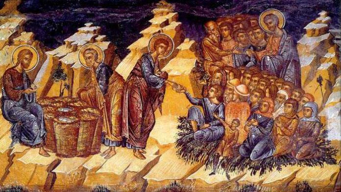 Aşadar, la Sfânta Evanghelie aflăm că într-o zi, Mântuitorul decide să părăsească pentru o vreme Capernaum-ul şi merge cu corabia într-un loc pustiu, în apropiere de Betsaida, în ţinutul stăpânit de către Filip, fratele lui Irod, însă, mulţimile nu L-au dat uitării pe Dumnezeu, ci, au mers după El, iar în pustie, Hristos le vorbeşte îndelung, mai multe ceasuri, despre Împărăţia Lui Dumnezeu şi cu acest prilej îi vindecă pe bolnavi. Dar, făcându-se seară, Apostolii îi adreasează lui Iisus Hristos, următoarele cuvinte: «Locul este pustiu şi vremea, iată, a trecut; deci, dă drumul mulţimilor ca să se ducă în sate să-şi cumpere mâncare» (Matei 14, 15), după care Mântuitorul Iisus Hristos le răspunde: ,,Nu trebuie să plece, daţi-le voi să mănânce!”, după care, auzind că este nevoie de hrană, un copil se prezintă în faţa Apostolilor cu cinci pâini şi cu doi peşti, pe care Mântuitorul le primeşte, pentru că ne mai spune Sfânta Scriptură că după ce le cere oamenilor să se aşeze pe iarbă, «privind spre cer, le-a binecuvântat şi frângând, le-a dat ucenicilor, iar ucenicii mulţimilor» (Matei 14, 19). În acest fel, cele cinci pâini şi cei doi peşti au fost înmulţite, astfel încât s-au săturat peste cinci mii de oameni, în afară de copii şi femei, rămânând la urmă şi 12 coşuri de firimituri. Şi îndată, Iisus Hristos i-a silit pe ucenici să intre în corabie şi să treacă înaintea Lui pe ţărmul celălalt, până ce El va da drumul mulţimilor. Acesta este chiar mesajul Evangheliei Duminicii a 8-a după Rusalii, ca un semn că Iisus Mântuitorul veghează, dar vrea să vadă că şi noi ostenim pentru salvarea noastră, deoarece, trebuie să ştim că El, Iisus, Fiul Lui Dumnezeu, Cel Care a hrănit mulţimile, chiar dacă o parte din aceste mulţimi, împreună cu fariseii, L-au pus pe Cruce, totuşi, El este trimisul Părintelui Ceresc, iar, ca Fiu al Părintelui Ceresc, ne ştie pe noi toţi, înrădăcinaţi în aceeaşi obârşie a Lui, ca fraţi ai Lui. De foarte multe ori, dacă nu chiar întotdeauna, El suferă împreună cu noi şi noi suferim împreună cu El, pentru a birui împreună cu El, ştiind că pe El, Fiul lui Dumnezeu, L-a trimis Tatăl, pentru noi oamenii şi pentru a noastră mântuire, ca să ne hrănească, dar să ne şi crească pe noi, prin suferinţă, prin încercări şi prin iubire, ca şi prin nevoinţă să biruim! Cum a spus El: ,,În lume încercări veţi avea; dar îndrăzniţi! Eu am biruit lumea”. Aşadar, cu El biruim orice încercare, orice lipsă, orice nevoie, ştiind că atunci când e nevoie, Mântuitorul Iisus Hristos intervine din iubire pentru noi, ca un Dumnezeu Care hrăneşte mai întâi sufletele oamenilor, cu prezenţa Sa iubitoare şi milostivă, dar şi cu lumina cea negrăită a Cuvântului Său!!