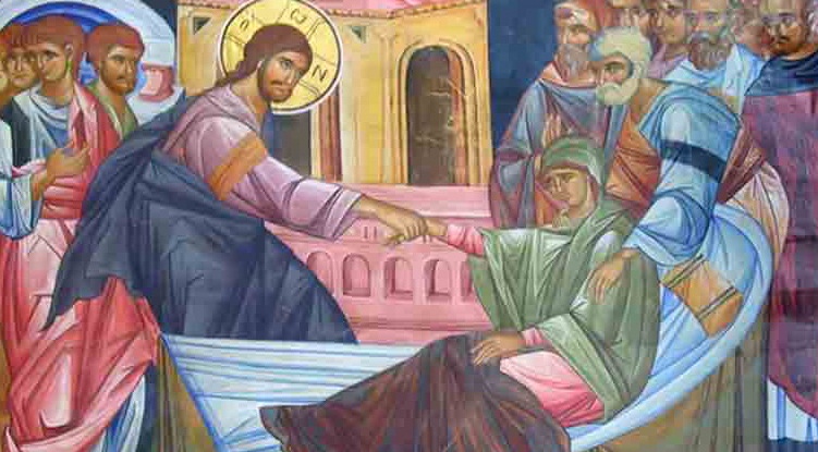 Așadar, în Duminica a 24-a după Rusalii se citește din Sfânta Evanghelie despre Învierea fiicei lui Iair – una dintre cele trei învieri pe care ştim că le-a făptuit Mântuitorul Hristos în timpul vieţii Sale pe pământ, când Sf. Evanghelist Luca ne arată că mai-marele sinagogii din Capernaum, pe numele său Iair, avea o fiică de doisprezece ani care se zbătea între viaţă şi moarte, acesta fiind singurul copil pe care îl avea. Deci, auzind el de Mântuitorul Iisus Hristos că a vindecat o mulţime de bolnavi, îndată şi-a făcut loc printre cei care-L împresurau pe Iisus, a îngenuncheat la picioarele Lui, i-a spus durerea sa şi L-a rugat să meargă la casa lui pentru a vindeca pe fiica sa grav bolnavă. Vedem că Iair L-a chemat pe Domnul să vină la casa lui şi să-şi pună mâna Sa deasupra fiicei sale, iar credința lui avea ceva trupesc întrânsa, când a spus: «Pune mâna Ta peste ea», ca un fel palpabil de vindecare, de parcă ar fi avut Cuvântul Lui Hristos mai puţină putere decât mâna Sa! Oare, glasul care a liniştit furtuna şi a scos demonii din oamenii îndrăciţi şi l-a înviat pe Lazăr, cel de patru zile mort şi îngropat, n-ar fi putut s-o învieze pe copila lui Iair la fel de bine ca şi mâna Sa? Se vădește, astfel, puterea credinței omului! Domnul a fost, însă, preamilostiv şi nu l-a lipsit pe îndureratul părinte de grabnicul Său ajutor, chiar dacă a constatat o lipsă a credinţei acestuia! Mai aflăm, din relatarea Sf. Evanghelist, că pe drumul spre casa în care se afla fiica bolnavă pe moarte a lui Iair s-a săvârşit o minune asupra unei femei a cărei credinţă era mai mare decât a lui Iair, minune care l-a încredinţat pe îndureratul părinte că Hristos Cel plin de Har vindecă în orice chip s-ar apropia cineva de El. Deci, e vorba despre o femeie bolnavă de doisprezece ani de curgere de sânge, care cheltuise toată averea sa cu medicii, dar nu s-a vindecat.