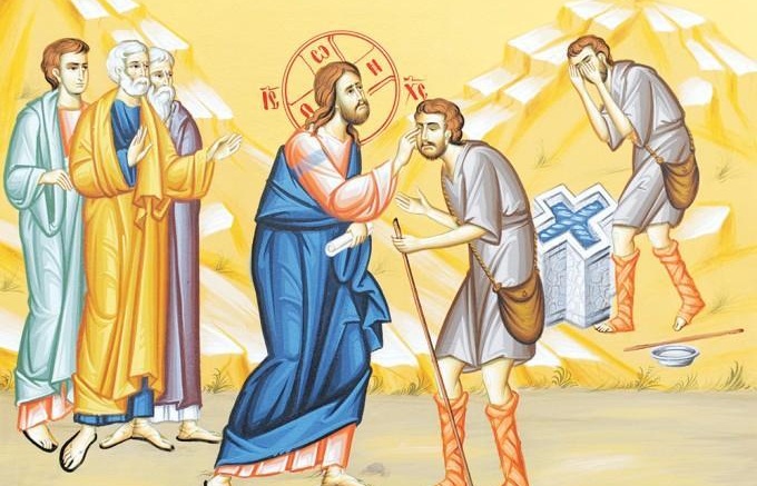Prin urmare, Sf. Evanghelist Ioan vorbeşte despre minunea vindecării unui orb din naştere, a unui tânăr din Ierusalim, deoarece, atunci când Mântuitorul Hristos a scuipat pe pământ şi a făcut ceea ce înseamnă tină şi a uns cu ea ochii orbului, apoi l-a trimis să se spele în izvorul Siloamului şi îndată ce s-a spălat, i s-au deschis ochii şi a început să vadă lumina soarelui cu ochii trupeşti, dar din acea clipă, chiar şi sufletul său deodată s-a înălţat la lumina credinţei, deoarece, din acea zi, orbul Îl cunoaşte pe Mântuitorul Hristos, crede în El şi I se închină ca Unui Dumnezeu. Aşadar, ni se spune că într-o zi de sabat, pe când Mântuitorul străbătea Ierusalimul împreună cu ucenicii Săi, zăresc undeva pe marginea drumului pe un orb din naştere, care-şi trăia destinul vieţii cu resemnare, aşteptând din partea trecătorilor un gest de milostenie. Până şi apostolii sunt tulburaţi de suferinţa şi umilinţa orbului, încât pun Mântuitorului întrebarea: «Cine a păcătuit; acesta sau părinţii acestuia de s-a născut orb?» (Ioan 9, 2). ,,Nici el, nici părinţii lui, răspunde Mântuitorul, ci, ca să se arate în el lucrările lui Dumnezeu” (Ioan 9, 3), adică, nu orice infirmitate a omului este o urmare firească a păcatului, ci, de foarte multe ori se întâmplă ca prin aceste neputinţe, Dumnezeu să-şi arate dragostea şi pronia Sa divină faţă de om. Deci, Mântuitorul s-a apropiat de cel orb, «a scuipat jos, a făcut tină din scuipat, a uns cu tină ochii orbului» (Ioan 9, 6), spunându-i, apoi, să se spele la Scăldătoarea Siloamului – considerată de iudei un simbol al binefacerilor «trimise» sau revărsate de Dumnezeu, căci «Siloam» înseamnă «trimis» (v. 7). Atunci, orbul din naştere, departe de a i se părea ridicolă cererea Mântuitorului, Îl ascultă, se ridică în picioare şi merge să-şi spele ochii fără să ceară explicaţii inutile. Ajuns la scăldătoare şi spălându-se, începe să vadă, fiind vindecat pe deplin. Evanghelistul nu ne prezintă bucuria acestui orb vindecat, cât mai ales reacţia cunoscuţilor şi, mai ales, a fariseilor din sinedriu, care întrebau: «Nu este acesta cel ce şedea şi cerşea?!» (Ioan 9, 8). Prin urmare, aceştia cer explicaţii: cine şi cum ţi-a deschis ochii, pentru că minunea s-a făcut vestită destul de repede. Şi pentru că cel ce fusese orb şi acum era vindecat spunea «sunt eu», cazul a stârnit reacţia cu totul neaşteptată a fariseilor. Acela care fusese orb spunea clar: «Omul care se numeşte Iisus a făcut tină şi a uns ochii mei; şi mi-a zis: “Mergi de te spală în scăldătoarea Siloamului, care se tâlcuieşte: «trimis»”! Deci, ducându-mă şi spălându-mă, am văzut» (Ioan 9, 11). De aceea, pentru farisei, nu putea fi motiv de bucurie şi au început un fel de anchetă, cu scopul de a-L discredita pe Mântuitorul Hristos, cu acuza că «nu este de la Dumnezeu, pentru că nu ţine sâmbăta» (Ioan 9, 16). Mai mult, pentru a-l intimida pe cel vindecat, au chemat părinţii acestuia, pentru ca prin aceştia, fariseii să obţină denigrarea Mântuitorului. «Şi i-au întrebat, zicând: Acesta este fiul vostru, despre care ziceţi că s-a născut orb? Deci, cum vede el acum?