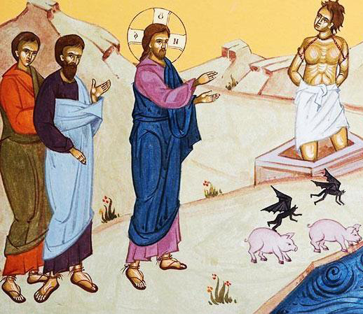 Deci, în Duminica a 23-a după Rusalii, avem vindecarea minunată, făptuită de către Domnul nostru Iisus Hristos, imediat după potolirea furtunii, şi care este raportată în cele trei Evanghelii sinoptice, însemnând momentul când Domnul trece de «cealaltă parte a lacului» (marea Galileei) şi soseşte la Decapole, adică, în ţară păgână, unde predomină închinarea la idolii «făcuţi de mână de om», în spatele cărora se ascund demoni, după cum ne învaţă Însuşi Domnul şi Apostolii Săi. Acolo, mai predomina şi magia, al cărei scop este de a folosi, prin ritualuri de caracter analogic şi incantaţii, puterea demonilor pentru a ajunge la scopuri malefice. De multe ori, poate uităm, ce însemna robia spirituală pe care o reprezenta păgânismul şi harul de nespus de a fi fost izbăviţi de acesta şi de a fi devenit creştini, fiindcă ne-am obişnuit cu acest har şi nu ne mai amintim de unde am plecat, din ce prăpastie ne-a izbăvit Mântuitorul Iisus Hristos! Aşadar, Evanghelia Sf. Ev. Luca ne relatează un episod cutremurător, descriindu-ne o minune săvârşită de către Iisus asupra unui om care se afla sub stăpânirea diavolului şi pe care, după ce l-a vindecat, Mântuitorul l-a îndemnat cu hotărâre: “Întoarce-te la casa ta şi spune tuturor cât bine ţi-a făcut ţie Domnul”. Prin urmare, a venit Iisus cu corabia în ţinutul Gerghesenilor, care este dincolo de apă, în faţa Galileii, dar, când a ieşit pe uscat, l-a întâmpinat un om din oraş care avea diavol şi care de multă vreme, în haină nu se îmbrăca şi în casă nu mai sălăşluia, ci în gropi de morminte. Văzându-L pe Iisus, a strigat şi a căzut înaintea Lui şi cu glas tare a grăit: «Ce ai cu mine, Iisuse, Fiule al lui Dumnezeu, Celui prea Înalt? Te rog, nu mă chinui»! Căci Iisus poruncea duhului necurat să iasă din omul acela, pentru că de mulţi ani îl apucase, şi-l legau în lanţuri şi în obezi, şi-l păzeau, dar el, sfărâmând legăturile, era mânat de diavol în pustie. Şi l-a întrebat Iisus, zicând: “care îţi este numele”? Iar el a răspuns: «legiune», căci mulţi diavoli intraseră în el. Şi-L rugau să nu le poruncească să meargă în adânc. Iar acolo era o turmă mare de porci, care păşteau pe munte; şi L-au rugat să le îngăduiască să intre în porci; şi le-a îngăduit. Şi, ieşind diavolii din om, au intrat în porci, iar turma s-a pornit de pe ţărm în lac şi s-a înecat. Iar păzitorii porcilor, văzând ce s-a întâmplat, au fugit şi au dat de veste în oraş şi prin sate. Atunci au ieşit locuitorii să vadă ceea ce s-a întâmplat şi au venit la Iisus şi au găsit pe omul din care ieşiseră diavolii îmbrăcat şi întreg la minte, şezând jos lângă picioarele lui Iisus, şi s-au înfricoşat. Iar cei care văzuseră le-au spus cum s-a mântuit cel îndrăcit. Şi L-a rugat pe El poporul ţinutului Gerghesenilor să plece de la ei, căci erau cuprinşi de frică mare. Iar Iisus a intrat în corabie şi s-a înapoiat. Dar bărbatul din care ieşiseră diavolii se ruga de El să-l lase lângă Dânsul; Iisus însă i-a dat drumul, zicând: întoarce-te în casa ta şi povesteşte cât bine ţi-a făcut ţie Dumnezeu. Şi el s-a dus, vestind prin tot oraşul cât bine i-a făcut Iisus» (Luca 8, 26-39). Desigur, oricine parcurge cu mintea şi cu inima paginile sfintelor Evanghelii sau ascultă cu atenţie pericopele evanghelice care se citesc la Sfânta Liturghie, devine impresionat de varietatea tablourilor, a locurilor şi a peisajelor descrise de mulţimea situaţiilor întâlnite, de profunzimea învăţăturilor date de către Mântuitorul şi de Duhul Dumnezeiesc ce le străbate, de oamenii de toate vârstele şi categoriile sociale, fiecare cu virtuţile, cu păcatele sau cu suferinţele lui, cu atitudini diferite faţă de Mântuitorul şi de noua Sa învăţătură, în centrul căreia stă dragostea faţă de Dumnezeu şi faţă de semeni, ca o dovadă certă că Dumnezeu vindecă păcatul care îi înstrăinează pe oameni de ei înşişi prin «lucrarea» suspectă a demonilor.