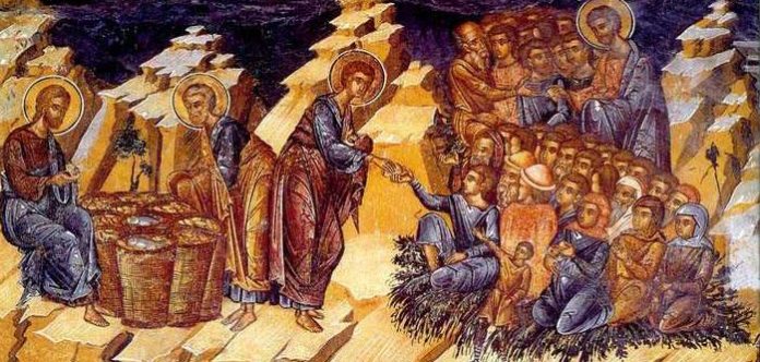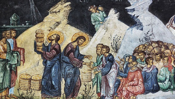 «Şi privind la cer, a binecuvântat şi, frângând, a dat ucenicilor pâinile, iar ucenicii, mulţimilor»