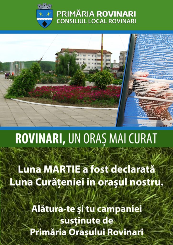 Acţiunile edilitar-gospodăreşti de primăvară au debutat şi în oraşul Rovinari! Administraţia locală atrage atenţia cetăţenilor şi societăţilor comerciale să contribuie activ la înfrumuseţarea şi curăţenia oraşului. “Rovinari e casa ta! Fii gospodar, nu arunca! Primăria orașului Rovinari declară luna martie, Luna Curățeniei. Facem apel către cetățenii orașului, societățile comerciale, instituțiile publice, unitățile de învățământ, asociațiile de proprietari și reprezentanții cultelor, de a participa, în număr cât mai mare, la acțiunile pe care le vom demara în perioada următoare. Vom toaleta și igieniza copacii, vom curăța vegetația, vom planta puieți și flori în majoritatea zonelor din oraș. De asemenea, ne vom ocupa și de curățirea șanțurilor, repararea gardurilor, întreținerea locurilor de joacă pentru copii, reparații și zugrăvire clădiri și vom realiza acțiuni de deratizare pentru un mediu sănătos. Vrei un oraș curat? Vrei să fii un exemplu de urmat? Vino alături de noi!”, este mesajul transmis de conducerea Primăriei Rovinari.