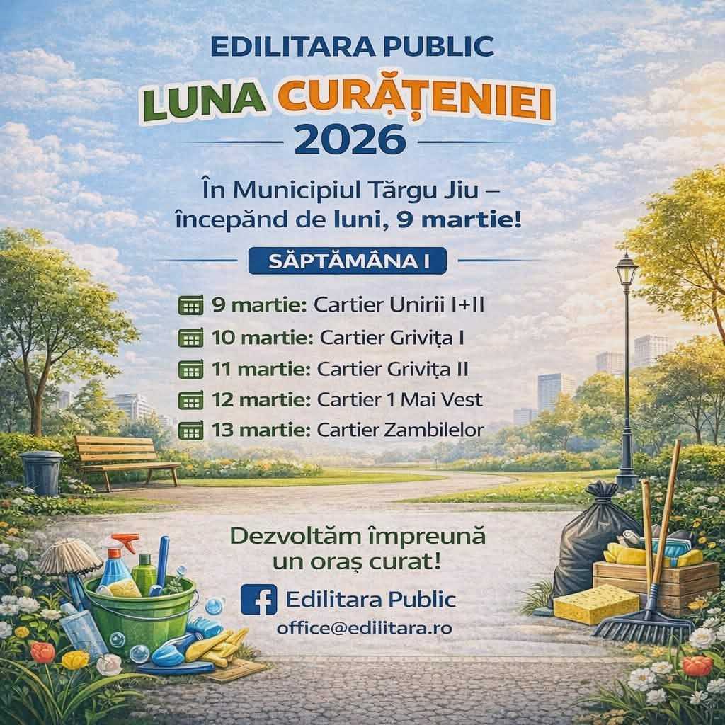 Începând de luni, 9 martie, echipele Edilitara Public S.A. dau startul intervențiilor din cadrul Lunii Curățeniei în municipiul Târgu Jiu.