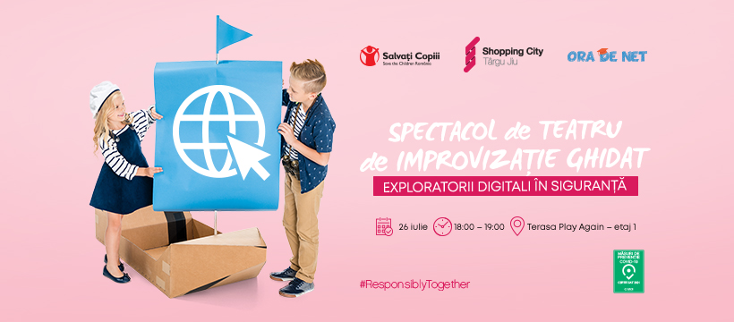 Organizația Salvați Copiii, alături de Shopping City Târgu Jiu organizează luni, 26 iulie, începând cu ora 18.00, spectacolul de improvizație “Exploratorii digitali în siguranță”, un eveniment gratuit, dedicat copiilor și părinților, pe teme legate de siguranța în mediul online.