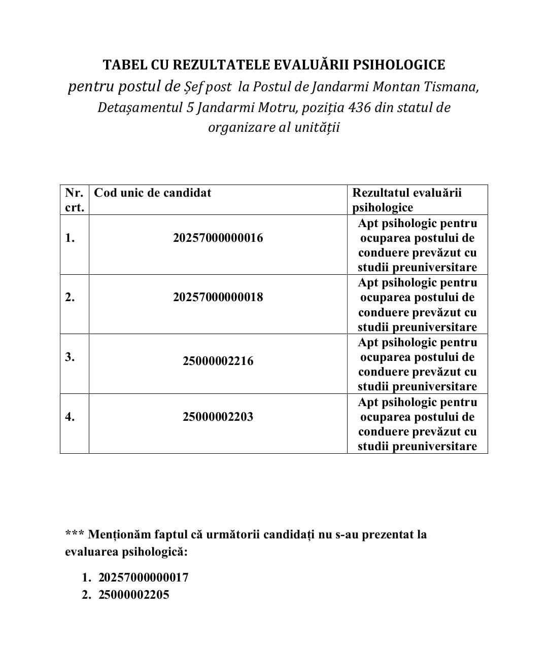 Patru candidați pe un loc au rămas în cursă, fiind declarați apți la evaluarea psihologică, după ce alte două persoane nu s-au mai prezentat la Institutul de Studii pentru Ordine Publică din București, pentru a fi testate. Concursul organizat de Inspectoratul de Jandarmi Judetean Gorj constă în două probe: evaluarea dosarului de recrutare, care va avea loc marți și interviul, care va fi susținut pe 14 mai 2025. „Evaluarea dosarelor de recrutare, ca probă de concurs, are drept scop aprecierea, cuantificarea şi valorificarea în procesul de selecţie a experienţei profesionale a candidaţilor, a conduitei şi evoluţiei în carieră, precum şi a cunoştinţelor profesionale dobândite prin diverse forme de pregătire, cu utilitate directă pentru îndeplinirea eficientă a atribuţiilor postului scos la concurs. Interviul are drept scop aprecierea cunoştinţelor profesionale, în acord cu tematica şi bibliografia de concurs, precum şi a aptitudinilor, abilităţilor şi motivaţiilor relevante în raport cu atribuţiile specifice postului”, se precizează pe site-ul Ministerului Afacerilor Interne. Va fi declarat admis candidatul care a fost declarat „promovat” la fiecare probă şi a obţinut cea mai mare notă finală, calculată prin însumarea punctajului obţinut la proba de evaluare a dosarelor de recrutare şi a punctajului rezultat prin ponderea cu 70% a notei finale la proba interviului. În situaţia în care mai mulţi candidaţi obţin aceeaşi notă este declarat „admis” candidatul care are cea mai mare vechime în specialitatea postului. „În situaţia în care mai mulţi candidaţi au aceeaşi vechime în specialitatea postului, este declarat admis candidatul care are cea mai mare vechime în studiile necesare postului vizat a fi ocupat. În situaţia în care nu se reuşeşte departajarea candidaţilor pe criteriile prevăzute anterior, preşedintele comisiei analizează datele înscrise în dosarele de recrutare ale candidaţilor şi rezultatele obţinute la interviu pe fiecare item şi decide cu privire la candidatul ce urmează a fi declarat admis”, au mai anunțat reprezentanții Ministerului Afacerilor Interne.