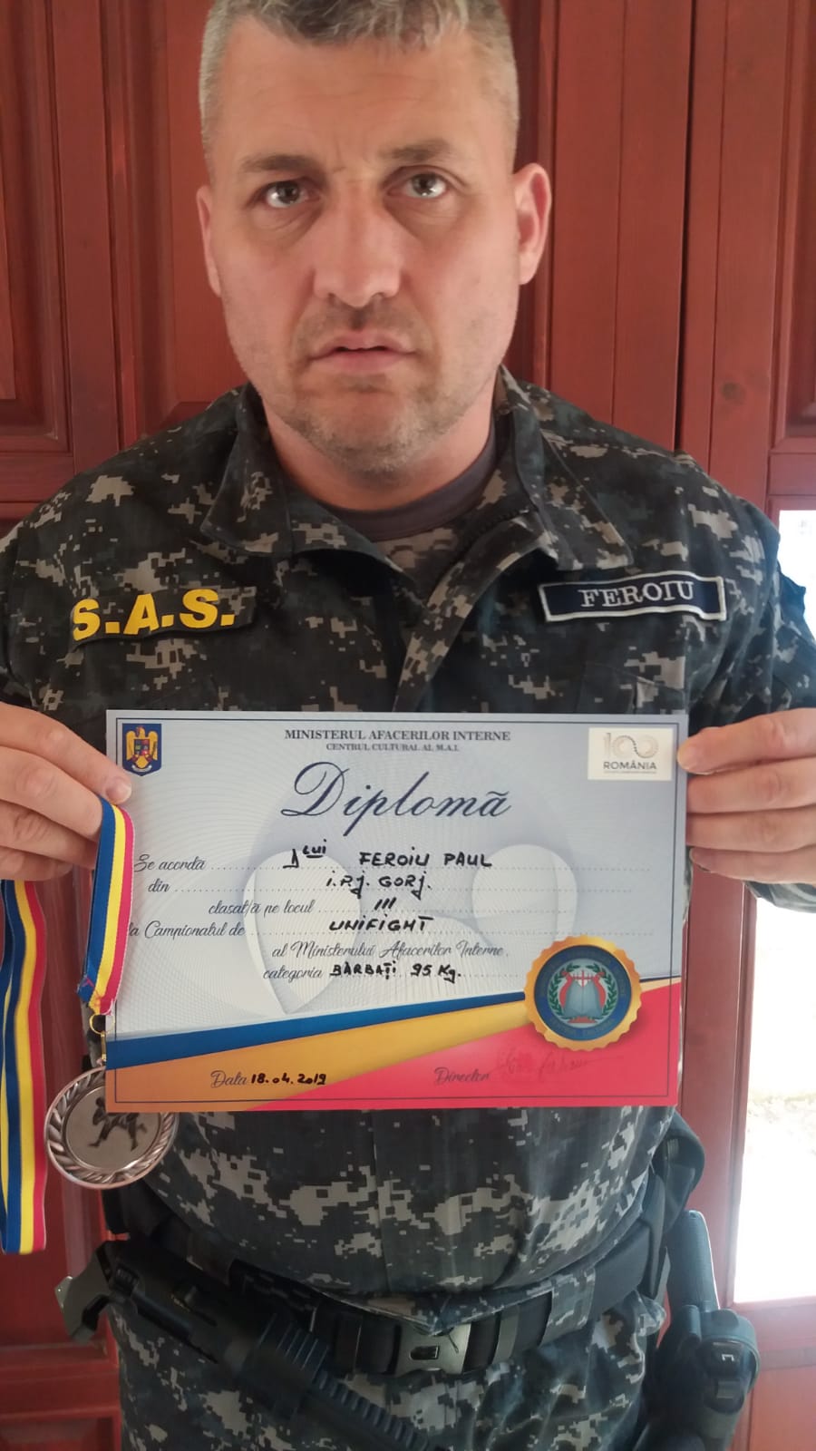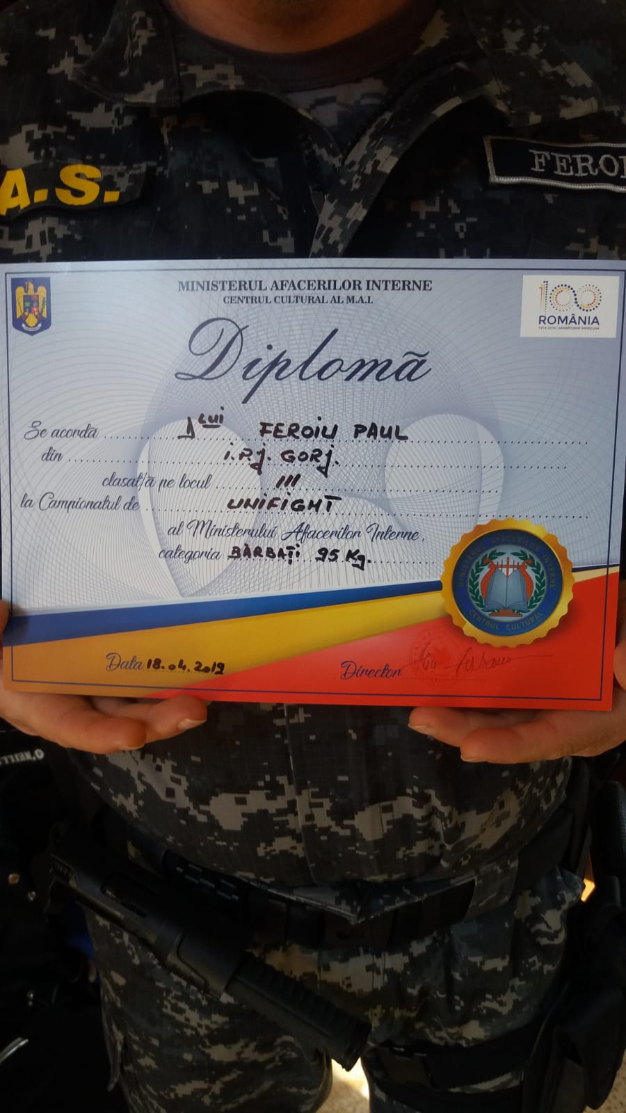 Paul Feroiu, luptător din cadrul Serviciului pentru Acțiuni Speciale al Inspectoratului de Poliție Județean Gorj, a urcat din nou pe podium, de această dată la Campionatul Național de Unifight al Ministerului Afacerilor Interne, desfășurat în perioada 16-19 aprilie, în localitatea Buziaș, din județul Timiș. Agentul șef principal a ocupat locul 3, la categoria 95 de kilograme, fiind singurul participant din județul Gorj.