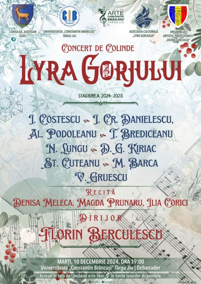 Un public numeros aștepta marți, 10 decembrie, în liniște, în sala Universității „Constantin Brâncuși”, mângâierea unui astfel de dar – Concertul de colinde al Coralei „Lyra Gorjului” (Camelia Eleonora Popescu, Georgiana Păducel, Alina Diana Betej, Alina Lăcătușu, Loredana Buliga, Ștefania Gîlcescu Haidău, Ramona Nicoleta Lăcătușu, Ionuț Pătrulescu, Florin Dumitrescu, Cosmin Brehuță, Claudiu Sebastian Hosu, Ovidiu Vezure, Ștefan Socaci). Dirijor, Florin Berculescu. Momente de poezie în interpretarea elevilor Liceului de Arte „Constantin Brăiloiu” (Denisa Meleca, Magda Prunaru, Ilia Corici) au alternat cu muzica într-un tandem al speranței.