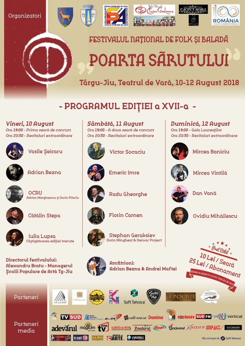 Conducerea Școlii Populare de Artă (ȘPA) Târgu-Jiu reamintește gorjenilor iubitori de muzică bună faptul că mâine, 10 august, începe Festivalul Național de Folk și Baladă “Poarta Sărutului”, ediția a XVII-a.