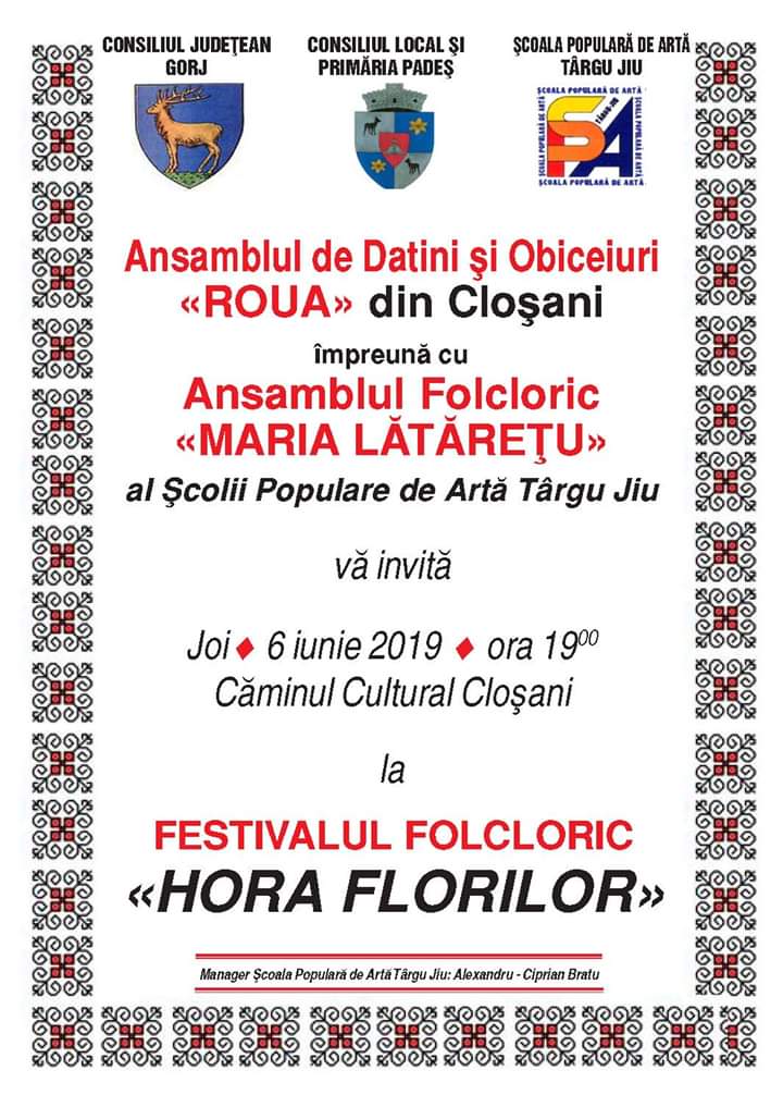 Școala Populară de Artă Târgu Jiu, alături de Consiliul Județean Gorj, Consiliul Local și Primăria Padeș, vă invită joi, 06 iunie 2019, ora 19:00, la Festivalul Folcloric ”Hora Florilor”. Eveniment susținut de Ansamblul de Datini și Obiceiuri ”Roua” din Cloșani, coordonat de prof. Carmen Sarcină, și Ansamblul Folcloric ”Maria Lătărețu”, dirijor Constantin Argint. De asemenea, vor urca pe scenă, pentru a aduce folclorul mai aproape de dumneavostră, soliștii ȘPA Tãrgu Jiu: Carmen Sarcină, Claudia Dascălu, Elena Balan, Nicoleta Lătărețu, Raluca Ghișe și Diana Istudor. Căminul Cultural Cloșani va fi gazda festivalului. Intrarea este liberă!