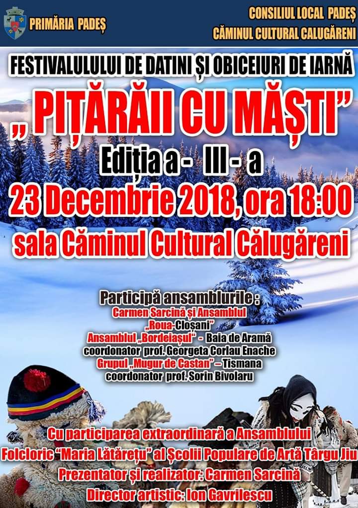 Şcoala Populară de Artă Târgu Jiu, în calitate de partener, anunță faptul că mâine, 23 decembrie, este organizat Festivalul de datini şi obiceiuri de iarnă „Piţărăii cu măşti”, ediţia a III-a. Evenimentul este organizat de Primăria și Consiliul Local Padeș, Căminul Cultural Călugăreni și se va desfăşura la Căminul Cultural Călugăreni, începând cu ora 18:00.