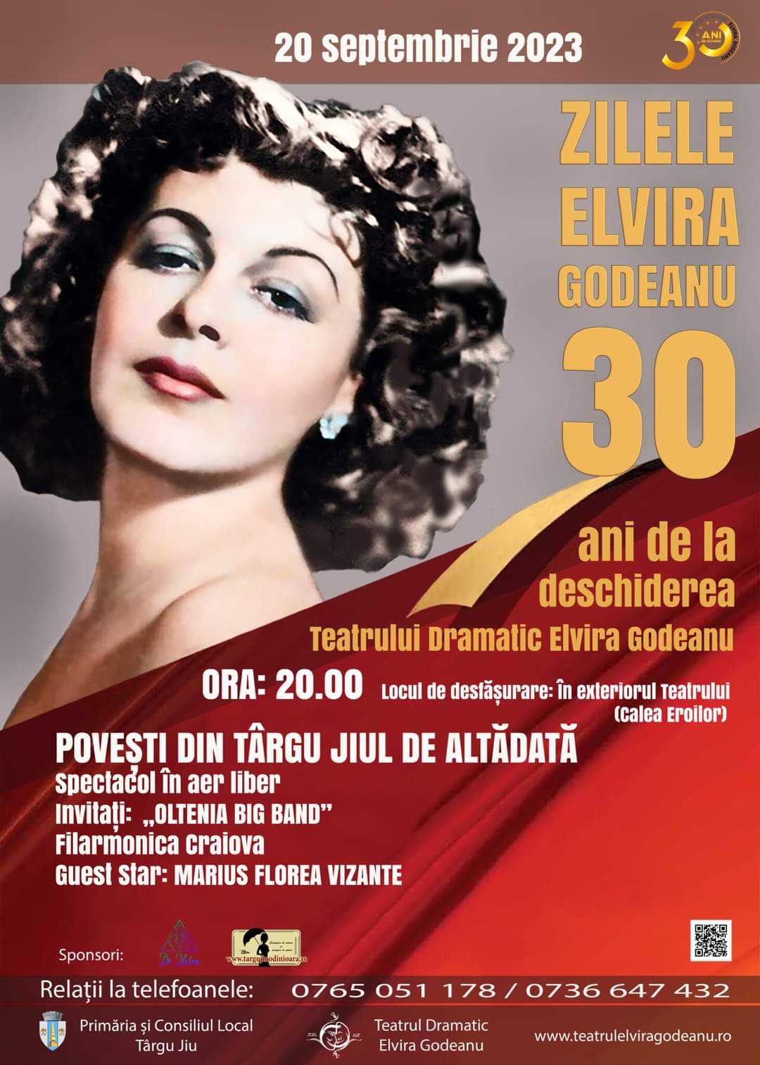 „Mâine, 20 septembrie, încep ZILELE „ELVIRA GODEANU”, și ce alt mod mai bun de a sărbători decât printr-un spectacol în aer liber, cu intrarea liberă, cu muzică live și cu invitați deosebiți: MARIUS FLOREA VIZANTE și OLTENIA BIG BAND, Filarmonica Craiova. Vă așteptăm în număr cât mai mare la „Povești din Târgu Jiul de altădată”, mâine, 20 septembrie, de la ora 20:00, pe Calea Eroilor, lângă teatru. Menționăm că, în cazul în care vremea nu va fi favorabilă, evenimentul se va muta în teatru, dar intrarea va fi în continuare liberă”, a anunțat conducerea Teatrului Dramatic” Elvira Godeanu” Târgu Jiu.