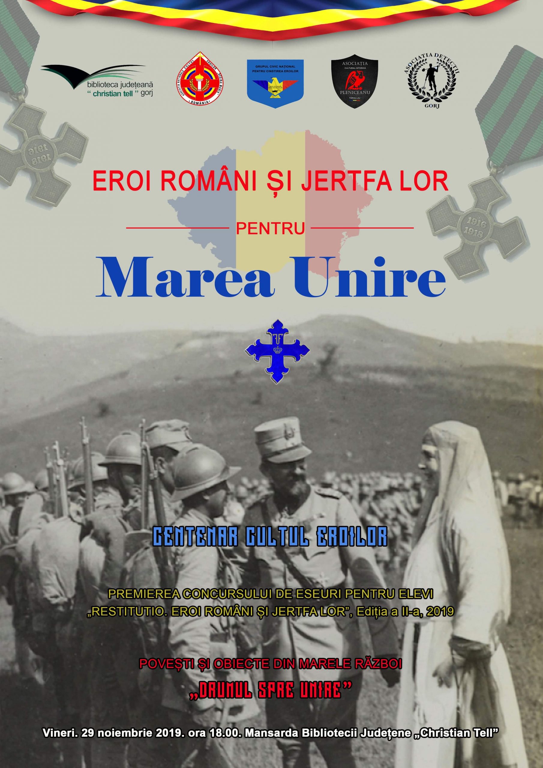 Biblioteca Județeană „Christian Tell” din Târgu Jiu va fi gazda primei ediții a evenimentului „Eroi români și jertfa lor pentru Marea Unire”, dedicat Zilei Naționale a României, vineri, 29 noiembrie 2019, începând cu ora 18.00.
