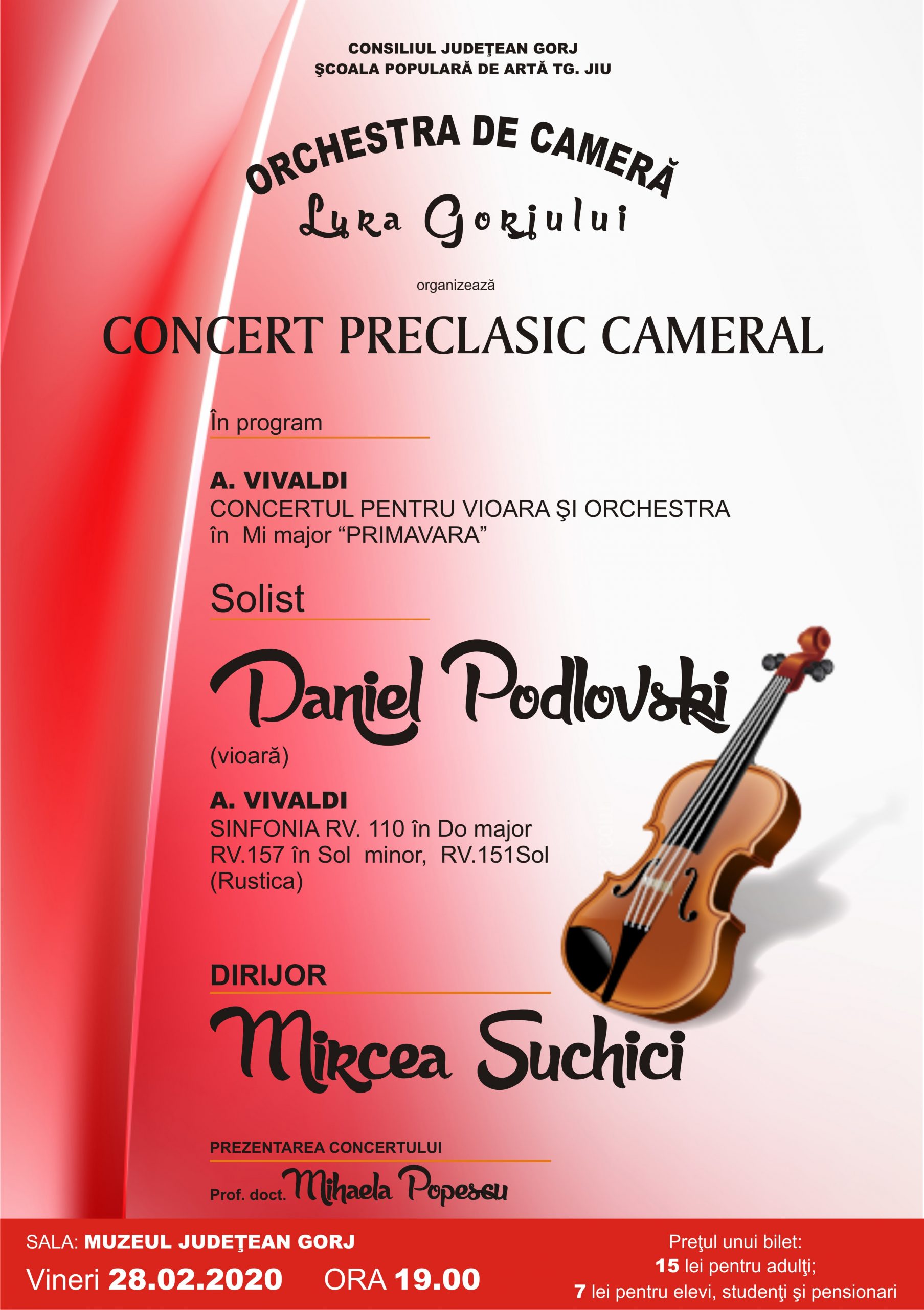 Vineri, 28 februarie 2020, la ora 19:00, dirijorul și violocelistul Mircea Suchici revine la pupitrul Orchestrei de Cameră ”Lyra Gorjului” și propune melomanilor târgujieni un program integral ANTONIO Vivaldi. Concertul este un prilej de a-l aplauda pe cunoscutul violonist Daniel Podlovschi, care va interpreta celebrul Concert pentru vioară și orchestra în Mi major ”Primăvara”. Seara, de la Muzeul Județean Gorj ”Alexandru Ștefulescu”, se va încheia cu Sinfonia RV. 110 în Do major
