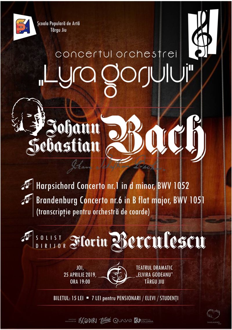 Școala Populară de Artă Târgu Jiu și Consiliul Județean Gorj invită melomanii târgujieni joi, 25 aprilie 2019, la Teatrul Dramatic “Elvira Godeanu”, începând cu ora 19:00, la Concertul Bach al Orchestrei de Cameră „Lyra Gorjului”. Sub bagheta dirijorului și pianistului Florin Berculescu, Orchestra de cameră va pune în valoare lucrări cunoscute menite să umple sufletele de bucurie. Din programul concertului vor face parte lucrările: Harpsichord Concerto nr.1 în d minor, BWV 1052; Brandenburg Concerto nr. 6 in B flat major, BWV 1051 (transcripţie pentru orchestră de coarde). Prezentatoarea evenimentului va fi Mihaela Sanda Popescu. Preţul unui bilet este de 15 lei, iar pentru elevi, studenți, pensionari este de 7 lei.Johann Sebastian Bach (n. 21 martie 1685, Eisenach — d. 28 iulie 1750, Leipzig) a fost un compozitor german și organist din perioada barocă, considerat în mod unanim ca unul dintre cei mai mari muzicieni ai lumii. Importanţa muzicii lui Bach se datorează, în mare parte, intelectului său. Florin Berculescu, în calitate de pianist, a susţinut peste 300 de concerte şi recitaluri, majoritatea la Târgu-Jiu, dar şi la Râmnicu Vâlcea, Craiova, Bucureşti, abordând un repertoriu vast. A urmat cursuri de specializare în Franţa, la Marsilia, cu Georges Boeuf (compoziţie) şi Anne Marie Girardelli (pian). A contribuit, împreună cu violoncelistul Mircea Suchici la afirmarea Orchestrei de Cameră “Lyra Gorjului” din Târgu Jiu, dirijând deseori chiar şi componenţa ei simfonică, fiind invitat în calitate de pianist să concerteze în compania acestei orchestre. A susţinut recitaluri de muzică şi poezie în compania unor mari actori români (Ilie Gheorghe, Ovidiu Iuliu Moldovan,Valeria Seciu, Florin Piersic) şi a colaborat în cadrul unui amplu recital cu naistul Gheorghe Zamfir. De asemenea, a desfăşurat o intensă activitate de profesor de pian şi acompaniament la Liceul de Artă “Marin Sorescu” din Craiova şi la Liceul de Artă “Constantin Brăiloiu” din Târgu-Jiu, unde este profesor în prezent.