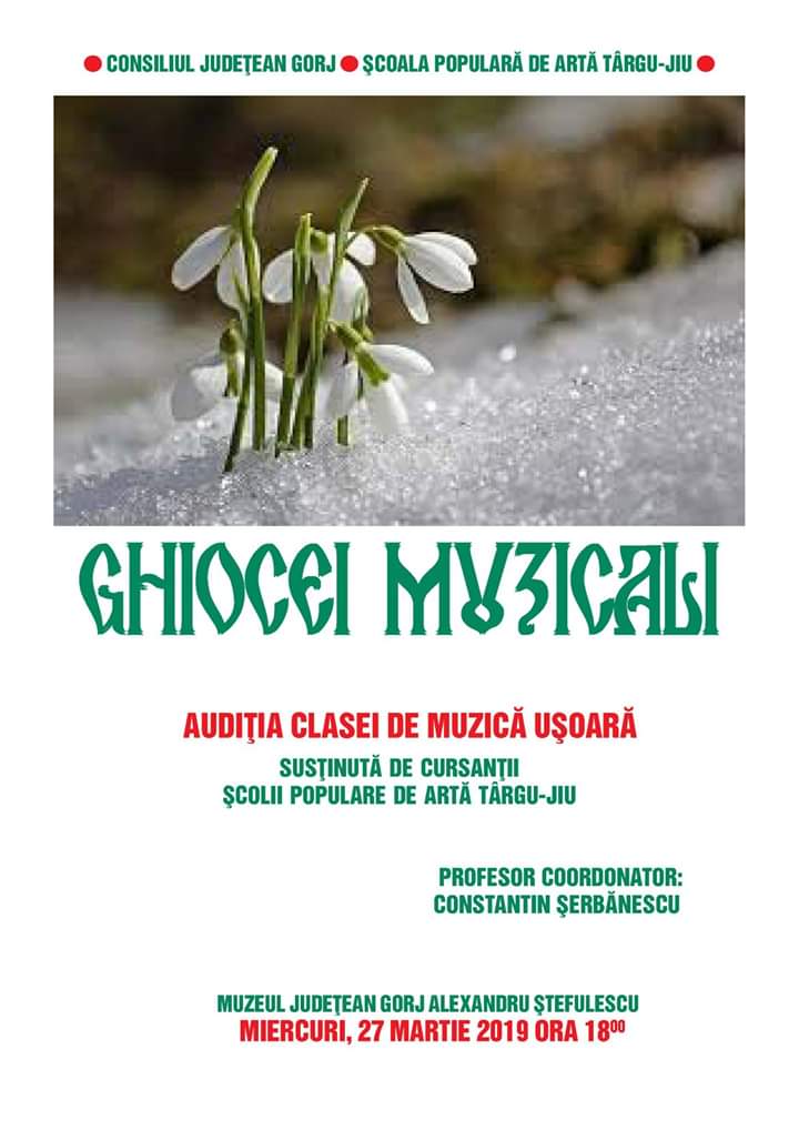Școala Populară de Artă Târgu Jiu, instituție aflată în subordinea Consiliului Județean Gorj, vă invită miercuri, 27 martie, la Muzeul Județean Gorj „Alexandru Ștefulescu”, la spectacolul „Ghiocei muzicali”.
