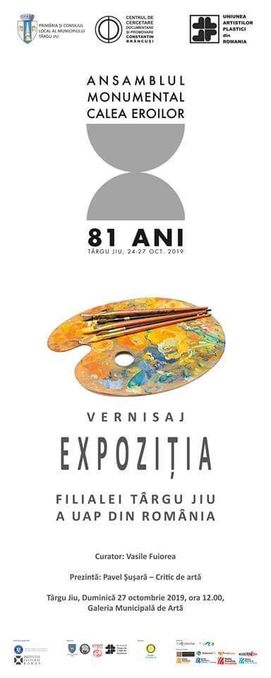 Duminică, 27 octombrie, ora 12.00, la Galeriile Municipale de Artă din Târgu Jiu, va avea loc vernisajul expoziției de arte vizuale: „Filiala Târgu Jiu a UAP din România”. Curator – Vasile Fuiorea. Cuvânt de deschidere: Pavel Șușară, critic de artă. Evenimentul expozițional, alaturi de alte expoziții importante ce se vor desfășura în aceiași zi la Muzeul Județean Gorj „Alexandru Stefulescu”, face parte din suita de manifestări dedicate aniversării a 81 de ani de la ridicarea Ansamblului Monumental „Calea Eroilor”, realizat de Constantin Brâncuși la Târgu Jiu, a Galei Premiilor UAP din România și a decernării Premiului Național „Brâncuși”.