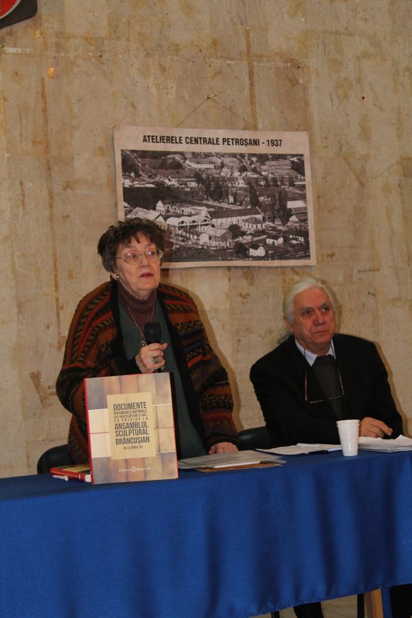 lângă Consiliul de Miniștri și de către Comisia Științifică a Muzeelor și Monumentelor Istorice și Artistice din cadrul Academiei R.P.R. A fost amintit apoi episodul din 1953 (dar care nu poate fi dovedit prin niciun fel de document), când Tănăsie Lolescu, un tânăr brigadier al Organizației de Tineret a Partidului Comunist, a primit ordin de la prim-secretarul organizației, tovarășul Constantin Babalîc, să demoleze Coloana. Ideea era că organizația de tineret trebuia să strângă fonduri pentru a contribui la organizarea Festivalului Mondial al Tineretului de la București, iar un mijloc de strângere a lor era colectarea de fier vechi. Pe scurt, cu un tractor IAR s-a tras de Coloană, în două încercări: prima cu lanțurile legate de primul modul al lucrării și apoi mai sus, la circa 2 m. Nu s-a obținut însă niciun rezultat, iar T. Lolescu a fost criticat aspru pentru eșecul său (informațiile se bazează pe comunicarea personală făcută de Tănăsie Lolescu lui S. Buliga). Un alt moment penibil din istoria Coloanei (de data aceasta la nivelul cel mai înalt) a fost prilejuit de ședința Academiei RSR (din 7 Martie 1951), când artistul și profesorul I. Jalea a dat “citire unei note de completare a comunicării d-sale asupra sculptorului C. Brâncuşi, prezentând şi numeroase planşe şi publicaţii cu reproduceri din Brâncuşi” (este notabil faptul că V. Eftimiu a făcut precizarea că “tov. Jalea a intenţionat prin comunicarea d-sale să reabiliteze operele valabile ale lui Brâncuşi”, iar Camil Petrescu a relevat “meritul comunicării tov. Jalea de a fi prilejuit discuţii interesante şi de a fi deschis probleme de o semnificaţie deosebită). Acest fapt a suscitat însă discuții aprinse, deoarece “cazul Brâncuși… ridică probleme importante”. Părerile distinșilor academicieni au fost, pe scurt, următoarele: I. Călinescu a constatat că “Brâncuşi nu poate fi considerat un creator în sculptură fiindcă nu se exprimă prin mijloacele esenţiale şi caracteristice acestei arte”, G. Oprescu a spus că sculptorul gorjean “a speculat prin mijloace bizare gusturile morbide ale societăţii burgheze”, iar Al. Graur a fost “împotriva acceptării în Muzeul de Artă al R.P.R. a operelor sculptorului Brâncuşi, în jurul căruia se grupează antidemocraţii în artă”. Adina Andrițoiu a prezentat o nouă perspectivă asupra comanditarilor și contributorilor la realizarea capodoperei de la Târgu-Jiu. Comunicarea a fost punctată de prezentarea în facsimil a documentelor de arhivă care demonstrează implicarea familiei Tătărescu, a Ligii Naționale a Femeilor Gorjene în finanțarea operelor brâncușiene și a străzii care urma să lege cele două parcuri în care au fost amplasate aceste lucrări. Un aspect reieșit din comunicare, remarcat de cei prezenți, a fost participarea substanțială a Societății Petroșani la execuția Coloanei fără Sfârșit. Sorin Buliga și Adina Andrițoiu au făcut, de asemenea, și o scurtă prezentare a cărții coordonată de ei, Documente din Arhivele Naționale ale județelor Gorj și Dolj cu privire la Ansamblul sculptural brâncușian de la Târgu-Jiu (apărută la Editura Brâncuși din Târgu-Jiu în anul 2017), din care au extras spre prezentare documentele din comunicările lor. Profesorul Ștefan Stăiculescu a vorbit despre protestul său privind demontarea Coloanei fără Sfârșit, pe când era director adjunct la Centrul “Constantin Brâncuși”. A amintit, de pildă, de două articole pe care le-a scris atunci (“Varia cu avaria” și “Când nepăsarea ajunge la gradul de sabotaj”) și, de asemenea, despre discuțiile pro și contra dezasamblării Coloanei din cadrul administrației locale și județene. În comunicarea sa a prezentat unele interpretări ale Mesei Tăcerii și ale Coloanei fără sfârșit. Poeta Claudia Voiculescu a dat citire unor pagini din jurnalul Irinei Procopiu (publicat la Editura Polirom), privind Coloana fără Sfârșit (pe care aceasta o numea “Pomenirea fără de Sfârșit” și o considera, asemenea multor contemporani ai săi, “o aberație mintală”). De asemenea, din cartea “Cronică de familie” a lui Petre Dumitriu (care a făcut liceul în Târgu-Jiu) a extras câteva citate legate de Masa Tăcerii (masa cu cele 12 scaune de tip “ouare”, interpretată ca o “agapă primordial” sau ca “Cina cea de Taină”) și de Coloana Infinită, văzută ca o “Coloană a nemuririi” (cu sensuri simbolice și magice, isprăvită cu “potirul în sus spre nemărginire”) și considerată ca fiind “cea mai pură abstracție a marelui maestru Bârlea (așa cum este numit Brâncuși în carte)”. Toma Velici a readus în atenție un fragment scris de I. D. Sârbu (petrilean din naștere) privind întâlnirea sa cu Brâncuși, pe când, tânăr fiind, curăța cu dalta și peria de sârmă “trapezele” Coloanei fără Sfârșit (aflată în construcție în Atelierele din Petroșani) de nisipul în care se turna fonta (“frecam, frecam de ne ieșeau ochii frecând” deoarece “nu trebuia să rămână fir de praf”, pe motivul că “trapezele” odată șlefuite intrau apoi “la galvanoplastie, urmând să fie acoperite de un strat de alamă”). Acolo venea directorul atelierului, Ștefan Georgescu-Gorjan “însoțit de un fel de popă mic, bărbos și repezit”. Mult mai târziu, în 1965, când a văzut Coloana fără Sfârșit, I. D. Sârbu a realizat că acel “popă afurisit” era chiar Brâncuși.