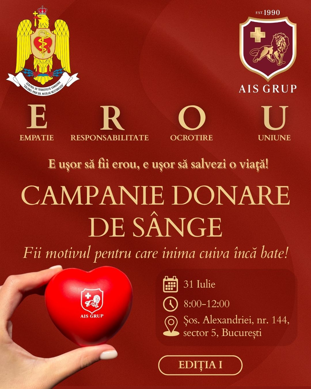Ministerul Apărării Naționale, prin Centrul de Transfuzie Sanguină „Colonel Profesor Doctor Nicolae Nestorescu”, în parteneriat cu AIS Clinics & Hospital, organizează prima ediție a Campaniei E.R.O.U., o inițiativă umanitară de donare de sânge.