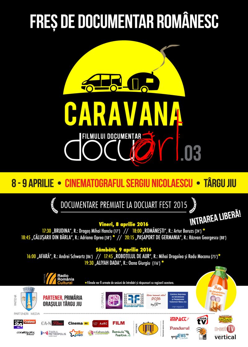 Programul Caravanei debutează vineri, 8 aprilie, de la 17.30, cu filmul “Româneşti” (R: Artur Borusz) şi continuă cu “Brudina” (R: Dragoş Mihai Hanciu), “Căluşarii din Bârla” (R: Adriana Oprea) şi “Paşaport de Germania” (R: Răzvan Georgescu). Sâmbătă, evenimentul începe cu “Afară” (R: Andrei Schwartz), “Roboțelul de Aur” (R: Mihai Dragolea şi Radu Mocanu), iar ziua se încheie cu “Aliyah Dada” (R: Oana Giurgiu). Filmele vorbesc despre o varietate de teme: istorie, artă, portrete ale unor oameni. La proiecţii vor fi prezenţi regizorii Adriana Oprea, Oana Giurgiu, Mihai Dragolea şi Radu Mocanu care vor participa la sesiuni de întrebări şi răspunsuri cu cei din sală. Târgu-Jiu este a treia oprire din traseul Caravanei, după Braşov şi Vălenii de Munte. Scopul proiectului este acela de a populariza evenimentele culturale în oraşe în care acestea nu sunt des întâlnite şi de a familiariza publicul cu acest gen de produse artistice, proiectul integrându-se totodată în zona marilor centre culturale. Caravana este o extensie a festivalului Docuart Fest, ajuns la ediţia cu numărul cinci.