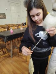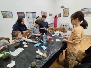 Apoi, au parcurs un adevărat maraton de meșterit, participând, pe rând, la cele 6 ateliere de Dragobete pregătite pentru ei: modelaj, pictură pe inimioare de lut ars, tors, țesut, mărgelit și confecționat mărțișoare din fire de lână și mărgele.