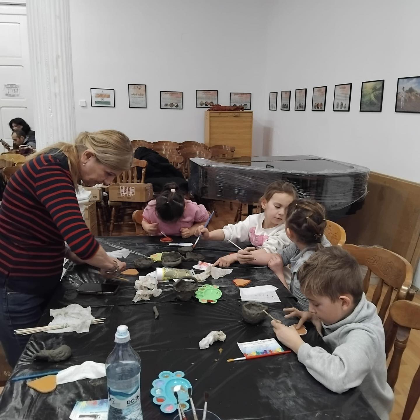 Apoi, au parcurs un adevărat maraton de meșterit, participând, pe rând, la cele 6 ateliere de Dragobete pregătite pentru ei: modelaj, pictură pe inimioare de lut ars, tors, țesut, mărgelit și confecționat mărțișoare din fire de lână și mărgele.