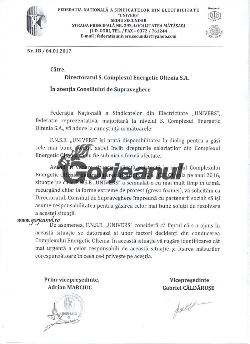 Pentru ca drepturile salariaților să nu fie afectate la începtul lui 2017, sindicatele din Federația Univers, au transmis Directoratului și Consiliului de Supraveghere al CE Oltenia o adresă prin care invită aceste structuri de conducere la dialog. Adrian Marciuc și Gabriel Căldărușe cer acestor două structuri, dar și partenerilor sociali să își asume responsabilitatea pentru găsirea celor mai bune soluții de rezolvare a acestei situații legate de lipsa rectificării cerute de conducerea companiei.