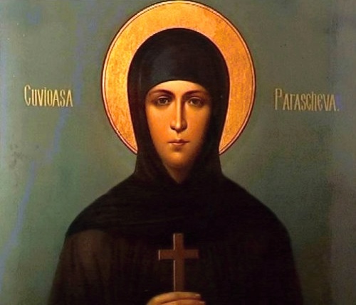 Sfânta prăznuită, astăzi, s-a născut în Epivata, acum numindu-se prin lege turcească «Selimpașa», pe țărmul Mării Marmara, în apropiere de Constantinopol care se numeşte acum Istanbul, pe atunci capitala Imperiului bizantin. Părinții săi, oameni de neam bun și credincioși, râvnitori spre cele sfinte, au crescut-o în frică de Dumnezeu, îndemnând-o spre deprinderea faptelor bune, dar mai ales a postului, rugăciunii și milosteniei pentru cei în suferinţă. Un frate de-al ei, după ce a învățat carte, s-a călugărit sub numele de Eftimie şi a fost ales episcop în localitatea Madite, pentru dragostea față de cele sfinte și pentru cultura sa deosebită. Sfânta Parascheva și-a petrecut anii copilăriei în casa părinților, sub ocrotirea acestora şi se spune că pe când avea zece ani, «fiind într-o biserică a Precistei» a auzit citindu-se la Sfânta Liturghie, cuvântul Evangheliei prin spusele Mântuitorului Hristos: «Oricine voiește să vină după Mine, să se lepede de sine, să-și ia crucea sa și să-Mi urmeze Mie» (Marcu 8, 34). Astfel, chemarea Mântuitorului a sădit în inima ei dorul de desăvârșire, încât și-a împărțit toate hainele săracilor, iar, același lucru l-a făcut și în alte împrejurări, fără să țină seama de mustrările părinților săi! Moștenind o mare avere de la părinți, împreună cu fratele ei, tânăra Parascheva a dăruit săracilor partea ce i se cuvenea de moștenire și, «părăsind frumusețea acestei lumi», s-a retras «în adâncul pustiei», dar, s-a oprit mai întâi la Constantinopol, unde a ascultat cuvinte de învățătură de la călugări și călugărițe cu aleasă viață duhovnicească. Urmând sfaturile acestora, a părăsit capitala, îndreptându-se spre ținutul Pontului, unde vreme de cinci ani a rămas la Mănăstirea Maicii Domnului din Heracleea, pentru ca de aici să plece spre Țara Sfântă, în dorința de a-și petrece restul vieții în locurile binecuvântate de viața pământească a Mântuitorului Iisus Hristos și a Sfinților Apostoli. După ce a văzut Ierusalimul, s-a așezat într-o mănăstire de călugărițe în pustiul Iordanului, unde s-a nevoit cu postul și s-a înălțat duhovnicește în rugăciune, întocmai ca Sfântul Ioan Botezătorul, ca Sfânta Maria Egipteanca și ca atâția alți ostenitori ai pustiei roditoare de desăvârșire duhovnicească! Într-o noapte, însă, pe când avea cam la 25 de ani, un înger i-a spus în vis, să se reîntoarcă în locurile părintești: «Să lași pustia și la moșia ta să te întorci, că acolo ți se cade să lași trupul pământului și să treci din această lume către Dumnezeu, pe Care L-ai iubit!», aşa că, după ce a avut această vedenie, sfânta «fără de voie lăsă pustia și se întoarse în lume și la Țarigrad veni», unde, în biserica Precistei ce este în Vlaherne și către icoana Sfinției Sale căzu și cu lacrimi se ruga așa și zicea: „N-am altă nădejde, n-am alt acoperământ. Tu-mi fii îndreptătoare, tu-mi fii folositoare… Că până am umblat în pustie pe tine te-am avut ajutor, iar acum, dacă m-am întors în lume, îndreptează-mă până la sfârșitul vieții mele, că altă nădejde nu am!”. În fine, din Constantinopol s-a îndreptat spre Epivata, localitatea în care văzuse lumina zilei, fără să spună cuiva cine este și de unde vine, dar, mereu cu lacrimi se ruga: ,,Doamne Iisuse Hristoase, caută din lăcașul Tău cel sfânt; am lăsat toate și după Tine am călătorit în toată viața mea. Și acum, îndură-Te Doamne, spune îngerului blând să ia cu pace sufletul meu!”, aşa că, împăcată cu sine, cu oamenii și cu Dumnezeu, și-a dat sufletul întru odihna Mirelui ceresc. A fost îngropată ca o străină, fără ca nimeni să știe cine era, dar, Dumnezeu, voind să o proslăvească, a descoperit în chip minunat cine era acea străină.