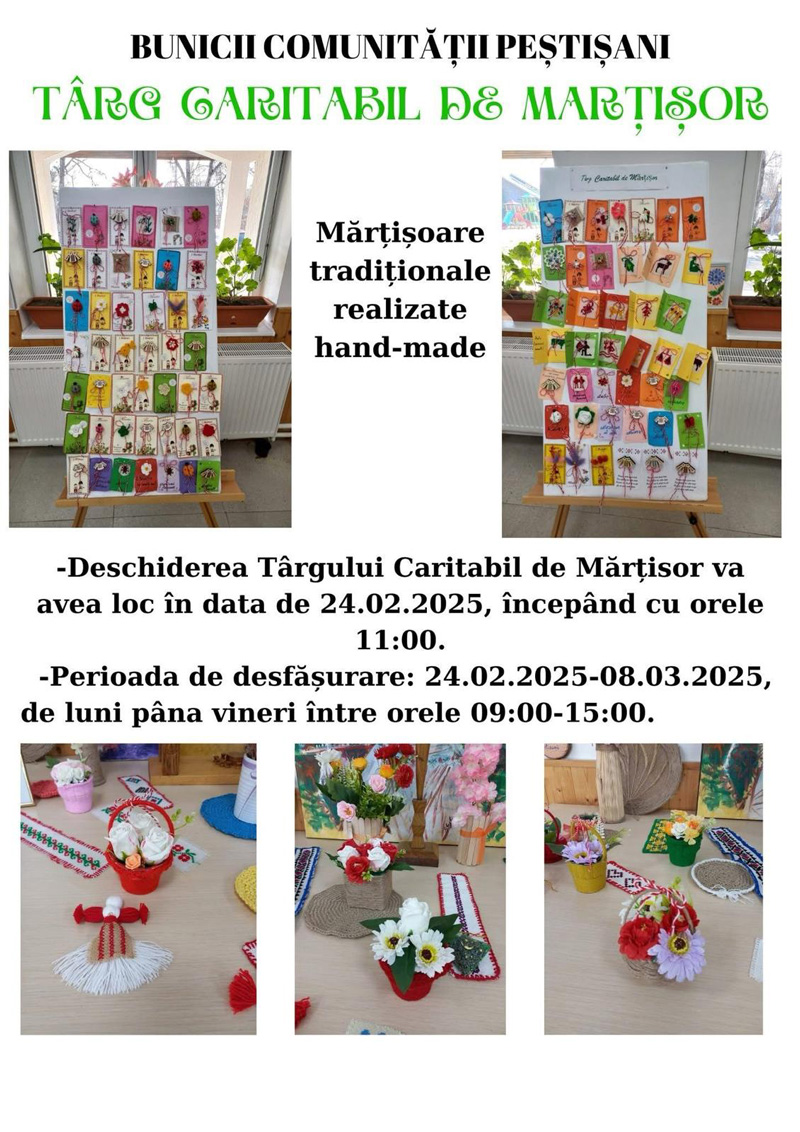 Mărțișoarele sunt unele aparent simple, care păstrează tradițiile populare ale zonei și care sunt lucrate manual de cei implicați în acest proiect. Ieri, „Bunicii Comunității” și-au prezentat roadele muncii lor, după care au jucat și o horă tradițională pentru a marca Dragobetele. Târgul Caritabil de Mărțișor va rămâne deschis aici până pe 8 martie, timp în care bunicii speră să strângă cât mai multe fonduri în contul muncii depuse pentru realizarea mărțișoarelor.