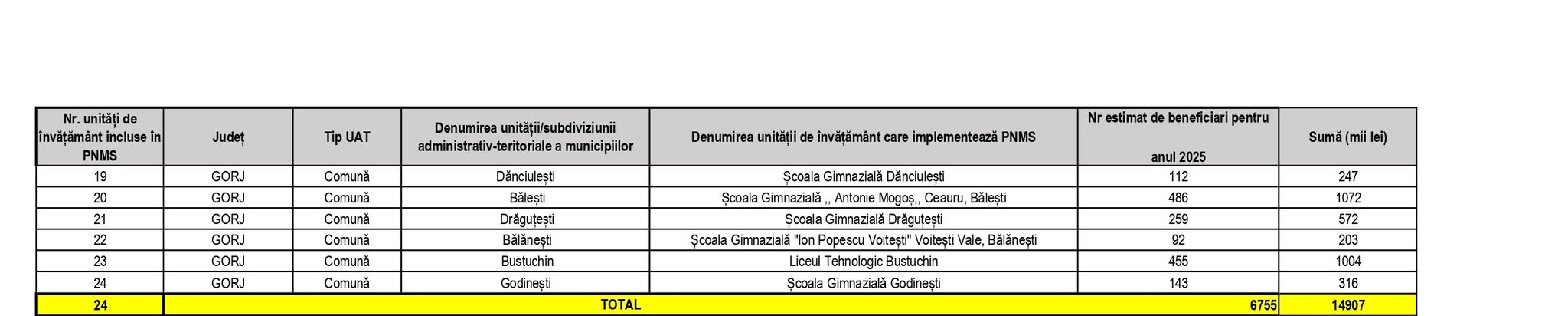 Lista școlilor incluse în programul „Masă sănătoasă” în 2025 a fost aprobată în ședința de Guvern de joi, 20 februarie. Un număr de 24 de unități de învățământ din Gorj sunt incluse în program, iar peste 6.700 de elevi din județ vor beneficia de masă caldă sau pachet alimentar, la școală. Bugetul alocat este de aproape 15 milioane de lei.