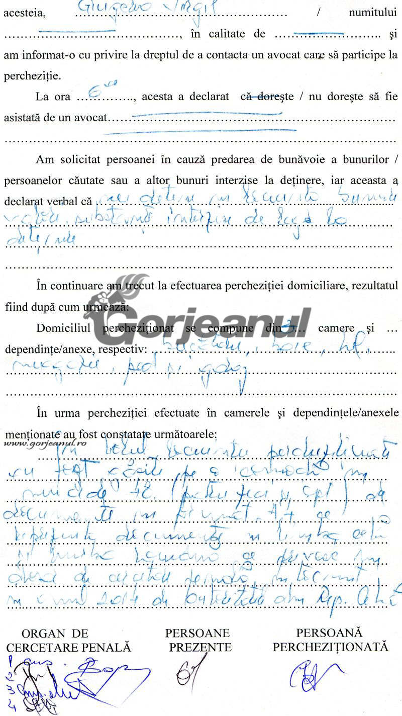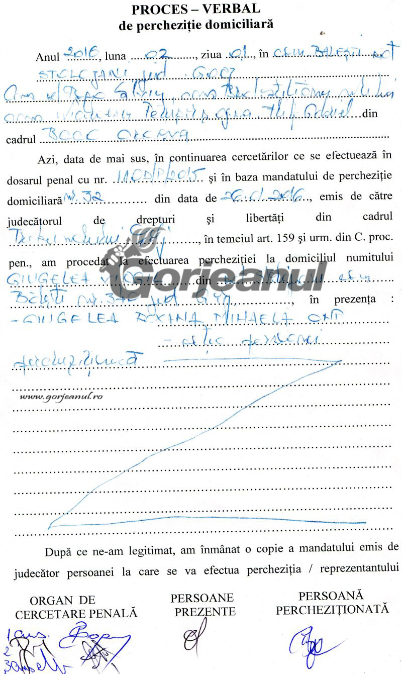 Anchetatorii care au descins luni dimineața la 15 gorjeni, cu scopul de a găsi autorii unui furt de bijuterii care a fost înregistrat în noaptea de 17 spre 18 mai 2014 în Slovacia, nu au găsit nimic din cele căutate cel puțin la domiciliul unicului reținut în acest dosar, Virgil Giugelea din Bălești, zis Fufea. O arată negru pe alb tocmai documentul lăsat în urmă de către mascați, mai exact procesul-verbal al percheziției domiciliare din Bălești, cu numărul 32 din 1 februarie 2016. Deși în mandatul 32, autorizat către DIICOT –Serviciul Teritorial Craiova, se arată că scopul percheziției este “identificarea, descoperirea și ridicarea de bijuterii, ceasuri și alte obiecte care au fost sustrase din magazinul de bijuterii din Slovacia, descoperirea și ridicarea altor ustensile, înscrisuri folosite în activitatea infracțională”, procesul verbal al percheziției arată că, cel puțin la Giugelea, nu s-a găsit nimic de genul.