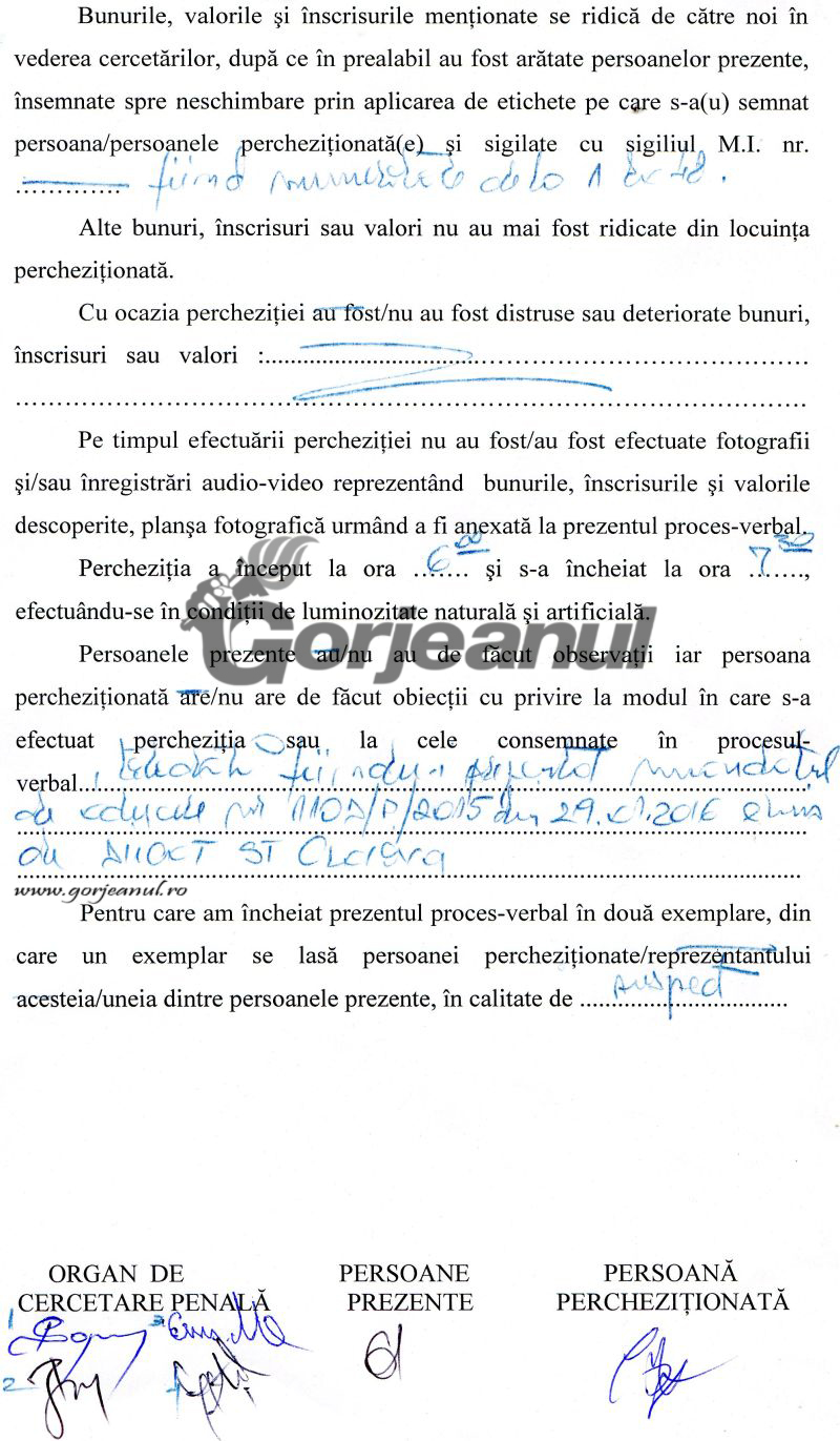 În document se arată că percheziția a început la ora 6 dimineața și s-a finalizat la 7.30, că lui Giugelea i s-a prezentat mandatul de aducere în dosarul 110D/P/2015 din 29 ianuarie 2016, dar și că respectivul “nu deține în locuință bunuri, valori, substanțe interzise de lege la denuț”. De asemenea, anchetatorii precizează în același document că la domiciliul percheziționat s-a găsit “pe o comodă un număr de 48 de file, în format A4, documente în limba cehă și română ce proveneau din dosarul de cercetare penală, din 2014, a autorităților Republicii Cehia”.
