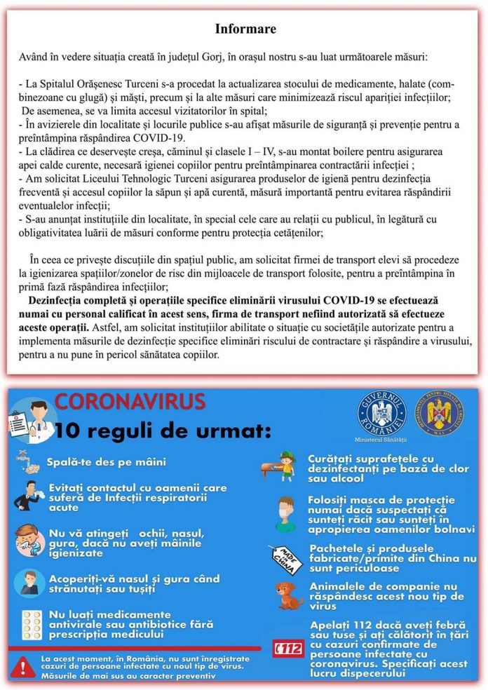 Măsuri la Turceni pentru evitarea îmbolnăvirii cu coronavirus