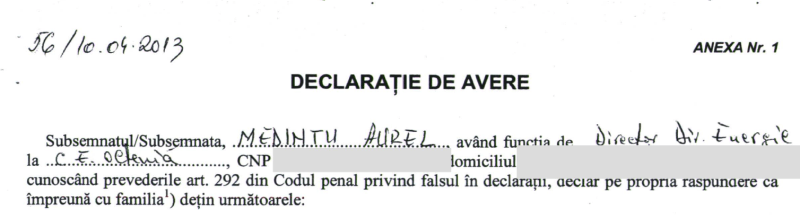 face publică și declarația de avere. Aurel Medințu arată astfel, negru pe alb, că în perioada cât a rămas fără serviciu, sau cel puțin în ultimul an înainte de revenirea la CEO, nu a stat în șomaj ori neremunerat, în ciuda vârstei înaintate. Medințu arată că lucrase la firma lui Giorgică Cornu din Timișoara, mai exact la CONFORT SA, societate care prestase în perioada respectivă tocmai în județul vecin Mehedinți, la Romag Termo, aparținând actualei falimentare RAAN.