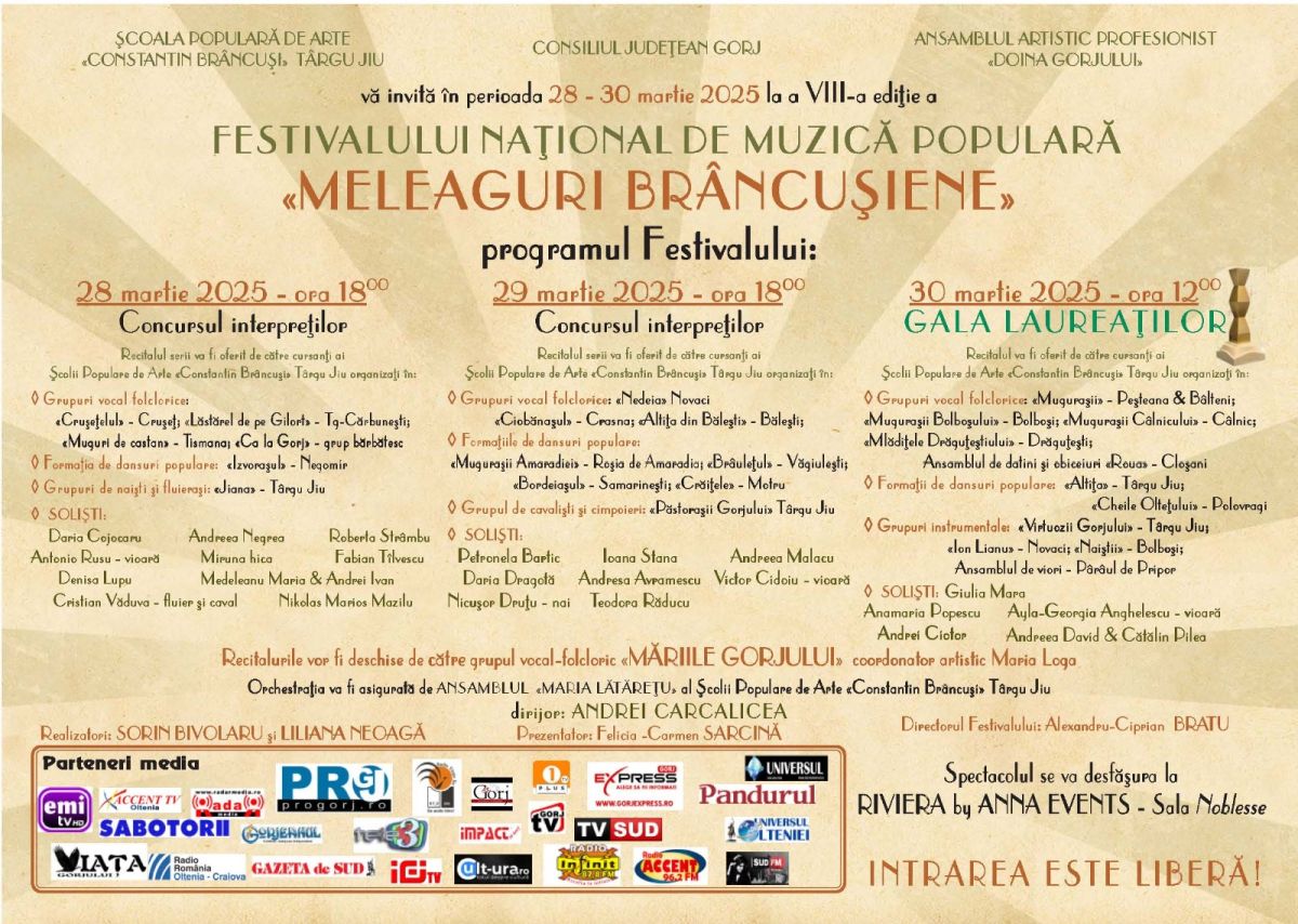 „Riviera by Anna Events din Târgu Jiu, sala Noblesse, va fi gazda Festivalului Național de Muzică Populară „Meleaguri Brâncușiene”, ediția a VIII-a. Intrarea este liberă pentru toți cei dornici să se bucure de frumusețea muzicii populare românești”, au transmis reprezentanții Școlii Populare de Arte din Târgu Jiu.