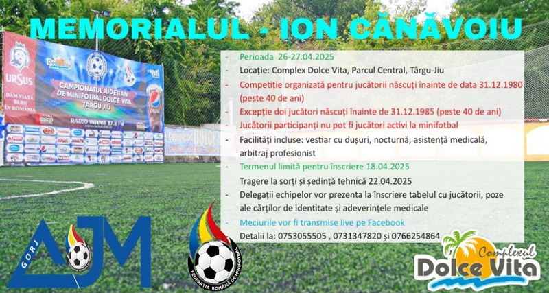 Asociația Județeană de Minifotbal Gorj, în parteneriat cu Complexul Dolce Vita Târgu-Jiu, va organiza Memorialul de Old Boys ,,Ion Cănăvoiu”. Competiția va avea loc în perioada 26-27 aprilie 2025. Turneul va cinsti memoria fostului mare jucător gorjean Ion Cănăvoiu, acesta fiind organizat sub egida Federației Române de Minifotbal.