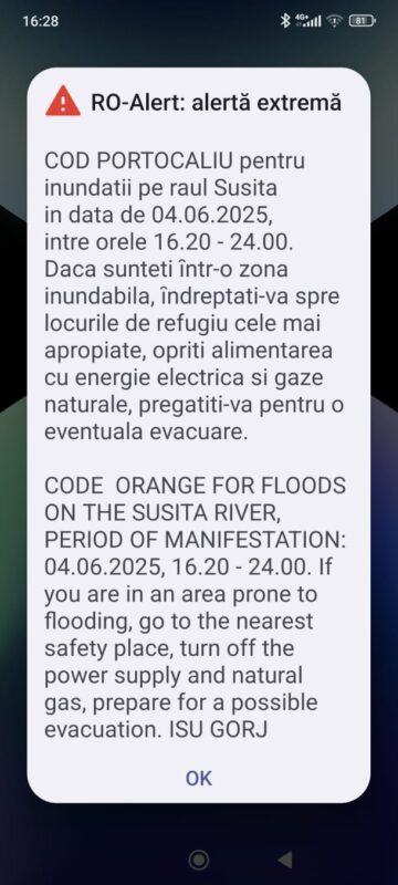 Poipulația din apropierea râului Șușița a fost avertizată prin Ro – Alert să se retragă în zonele de refugiu și să se pregătească pentru o eventuală evacuare.