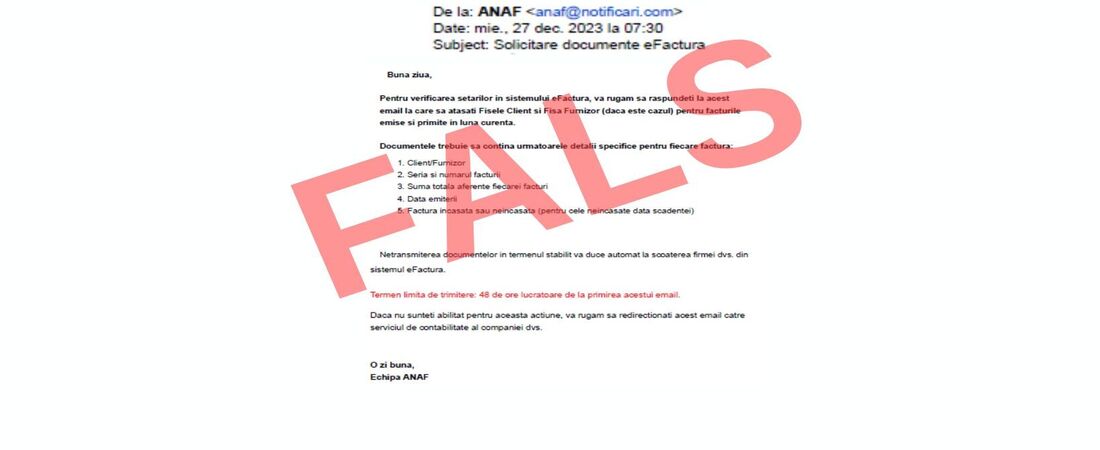 ANAF atenționează asupra unei campanii de mesaje false, transmise în numele instituției, prin care contribuabililor li se solicită ”Fișele Client și Fișa Furnizor (dacă este cazul) pentru facturile emise și primite în luna curentă, pentru verificarea setărilor în sistemul eFactura”.