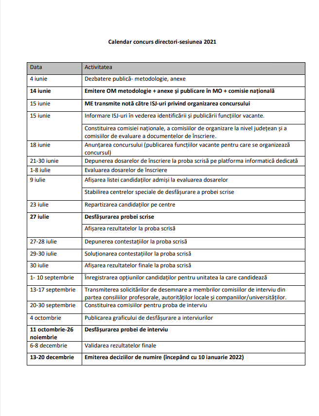 15 iunie – Informare ISJ-uri în vederea identificării și publicării funcțiilor vacante. Constituirea comisiei naționale, a comisiilor de organizare la nivel județean și a comisiilor de evaluare a documentelor de înscriere.
