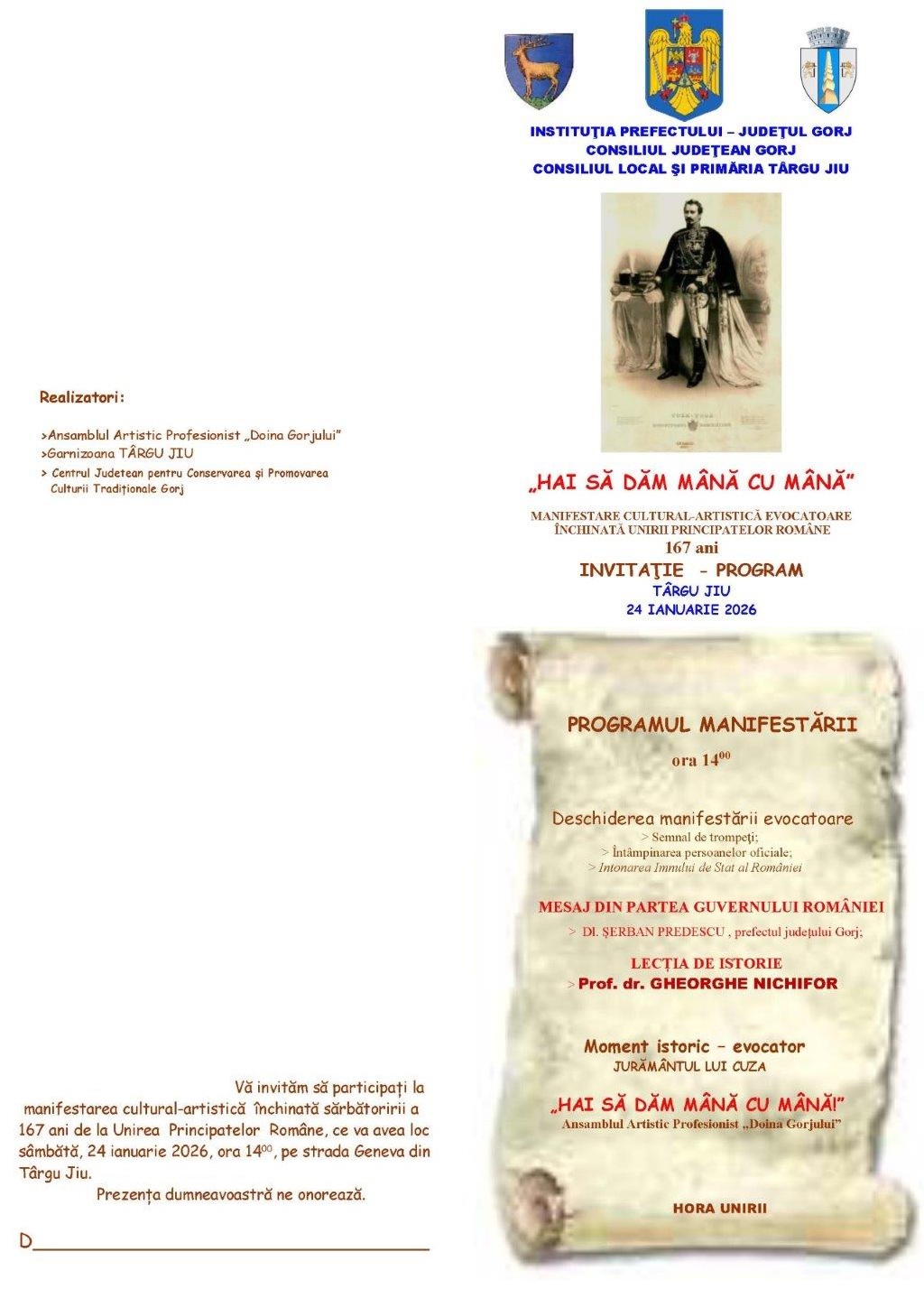 Autoritățile locale și județene din Gorj organizează sâmbătă, 24 ianuarie, la Târgu Jiu, manifestarea cultural-artistică evocatoare „Hai să dăm mână cu mână”, dedicată împlinirii a 167 de ani de la Unirea Principatelor Române.