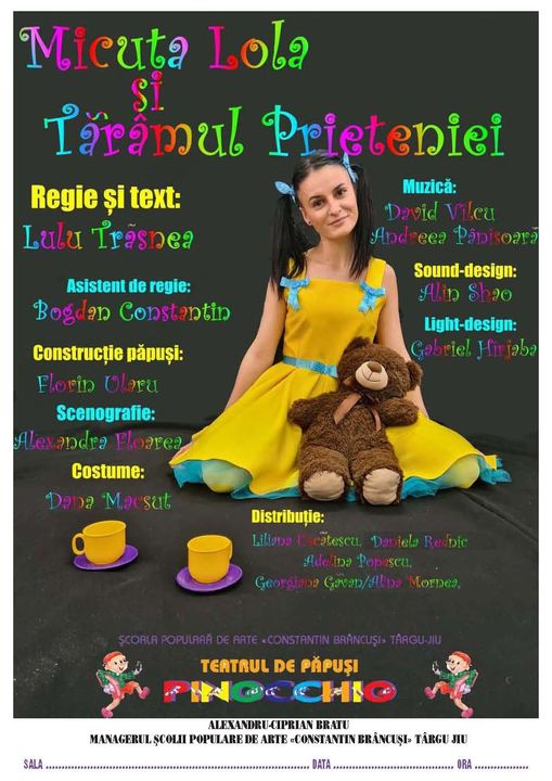 Teatrul de Păpuși “Pinocchio”, din cadrul Școlii Populare de Arte ”Constantin Brâncuși” Târgu Jiu, vă invita duminică, 30 mai 2021, ora 11:00, la Teatrul de Vară ”Nelu Dumitru” din Târgu Jiu, la spectacolul de teatru pentru copii “Micuța Lola și Tărâmul Prieteniei”. ”Spectacolul spune povestea Lolei, o fetiță mofturoasă, care nu știe să-și facă prieteni, îl rănește pe Domnul Pernă, ursulețul său de pluș. Cei doi ajung pe Tărâmul Prieteniei și, împreună cu Zâna Prieteniei și cu râma cea deșteaptă, Lola reușește să-i câștige prietenia Țesătoarei și să-și salveze cel mai bun prieten. Este o poveste foarte frumoasă, din care cei mici vor învăța să prețuiască și să păstreze prieteniile. Piesa de teatru este LIVE și veți întâlni atât personaje-păpuși, cât și actori la vedere. Mânuirea păpușilor este realizată de actorii păpușari: Liliana Uscătescu, Adelina Popescu, Georgiana Găvan, Daniela Rednic și Alina Mornea. Textul și regia sunt semnate de actrița și regizoarea Lulu Trăsnea. Cu speranța că v-am stârnit curiozitatea, vă așteptăm cu mare drag pentru a ne bucura împreună de mirajul acestei povești!”, au transmis organizatorii. Biletele se pot achiziționa de la sediul Școlii Populare de Arte ”Constantin Brâncuși” Târgu Jiu, în zilele de miercuri, joi și vineri, între orele 10:00-14:00. De asemenea, acestea se pot procura și înainte de începerea reprezentației. Spectatorul, prin achiziționarea biletului de intrare la spectacol, acceptă condițiile de desfășurare a acestuia, respectiv: măsurarea temperaturii, portul măștii, precum și respectarea distanțării sociale. În caz de vreme nefavorabilă, spectacolul se va desfășura la Teatrul Dramatic ”Elvira Godeanu” din Târgu Jiu.