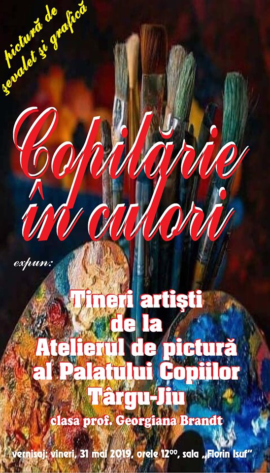 Tineri artiști de la Atelierul de pictură al Palatului Copiilor Târgu-Jiu, clasa profesoarei Georgiana Brandt, vor expune vineri, 31 mai 2019, de la ora 12.00, în Sala „Florin Isuf” a Centrului Județean pentru Conservarea și Promovarea Culturii Tradiționale Gorj. Este vorba despre picturi pe șevalet și grafică. Georgiana Brandt este membru UAPR, Filiala Cluj Napoca, și a avut numeroase expoziții atât în țară, cât și în străinătate. Lucrările expuse sunt dedicate zilei de 1 iunie, ziua copilului.Expoziția se numește „Copilărie în culori” și va rămâne deschisă o săptămână. ,,Vă așteptăm așadar să veniți cu cei mici la vernisarea expoziției care le este dedicată vineri, 31 mai 2019, la ora 12.00, în Sala Florin Isuf”, au transmis reprezentanții Centrului Județean pentru Conservarea și Promovarea Culturii Tradiționale Gorj.