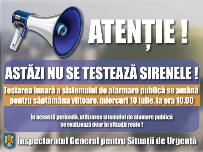 ,,În contextul desfășurării unei probe a Bacalaureatului, pentru a nu crea disconfort în rândul elevilor și profesorilor, în cursul zilei de miercuri, 3 iulie, nu au fost verificate sirenele de alarmare publică. Suntem alături de toți cei care parcurg «examenul maturității» și replanificam organizarea exercițiului de alarmare a populației pentru miercuri, săptămâna viitoare. În această perioadă, utilizarea sirenelor se va realiza doar în situații reale în care este necesară dispunerea de măsuri de autoprotecție pentru populație. Cele mai des întâlnite situaţii în care este alarmată populaţia prin intermediul sirenelor electrice şi electronice sunt dezastrele naturale și calamitățile, care pun în pericol viaţa persoanelor. Asigurăm opinia publică asupra necesităţii şi utilităţii derulării permanente a acestor antrenamente lunare”, au precizat reprezentanții Inspectoratului General pentru Situații de Urgență. Dacă nu ar fi fost anulat evenimentul, sirenele din țară ar fi emis, ieri, semnalul „Alarmă aeriană”, care are rolul de prevenire a populației civile asupra iminenței producerii unui atac aerian. În România, semnalele de alarmare a populației sunt: