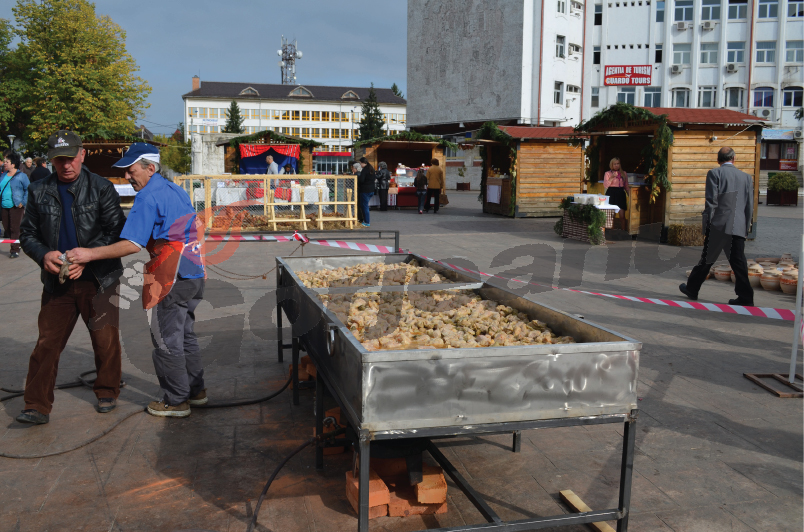 În ultima zi a festivalului, adică ieri, în Piaţa târgoveţilor, autorităţile locale au pregătit cea mai mare oală cu sarmale. “Pentru prepararea celor 10.000 de sarmale s-au folosit 290 de kilograme de carne şi 700 kilograme de varză, s-a lucrat două zile, la prepararea lor au lucrat 12 femei, şi doar ca să fie aşezate în oală a durat şase ore. În această după-amiază (n.r. ieri) vor ajunge la copiii orfani, la persoanele fără adăpost de la Casa Iris şi la copiii proveniţi de la casele de copii, tineri care au depăşit vârsta de 18 ani şi pe care noi îi monitorizăm. Ştim sigur că e cea mai mare oală de sarmale care s-a fiert în România, dar pentru a putea fi omologată în Cartea Recordurilor trebuia să plătim nişte taxe foarte mari pe care nu ni le puteam permite. Este vorba de 4.000 de lire. Ne pare rău că nu am putut face rost de o oală în adevăratul sens al cuvântului şi am fost nevoiţi să improvizăm. Ne interesasem să împrumutăm o oală imensă de la Primăria Cluj Napoca, însă după ce am discutat cu cei de acolo, deja nu mai aveau respectiva oală. Ne propunem ca pentru la anul să organizăm un record asemănător la o tocăniţă cu carne”, a declarat Teodora Ciobanu, directoarea Direcţiei Publice de Protecţie Socială (DPPS) Târgu-Jiu.