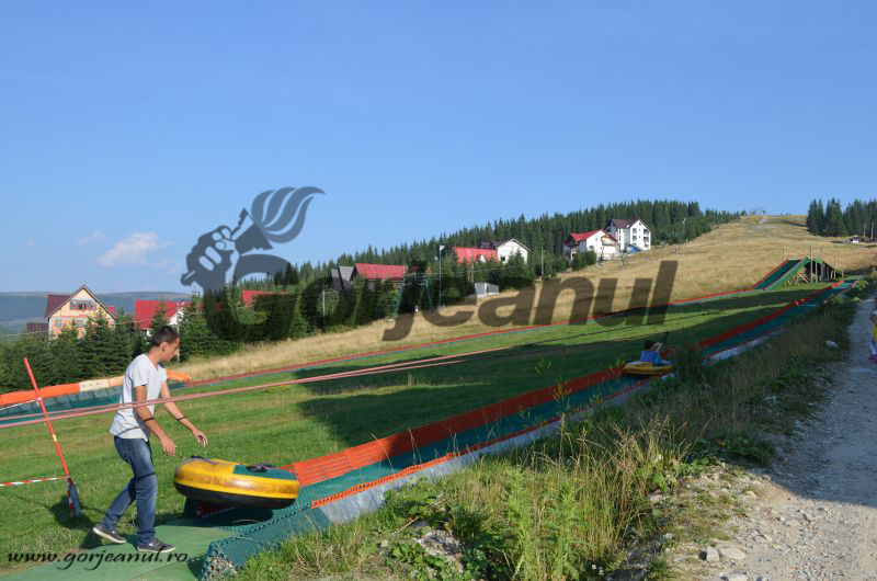intrare în staţiunea Rânca, dinspre Novaci. Traseul de aventură are nouă ateliere în lungime totală de 98 metri, care se încheie cu o tiroliană de 70 metri.