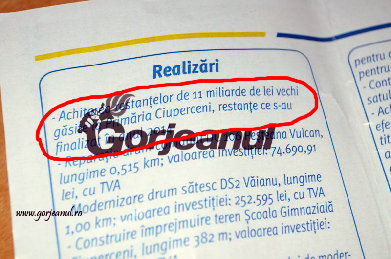 În ciuda acestor carențe profesionale, primarul Tăloi are tupeu să iasă iar în fața electoratului din Ciuperceni și să ceară a treia oară votul cetățenilor de aici. Face asta pornind însă de la o minciună, afișată, cu mândrie, în pliantul său electoral. Tăloi, care vrea, potrivit sloganului său electoral, să continue să “construiască” în comuna în care nu a construit nimic timp de opt ani, își trece la realizări “achitarea restanțelor de 11 miliarde de lei vechi găsite la Primăria Ciuperceni, restanțe ce s-au finalizat în anul 2014”.