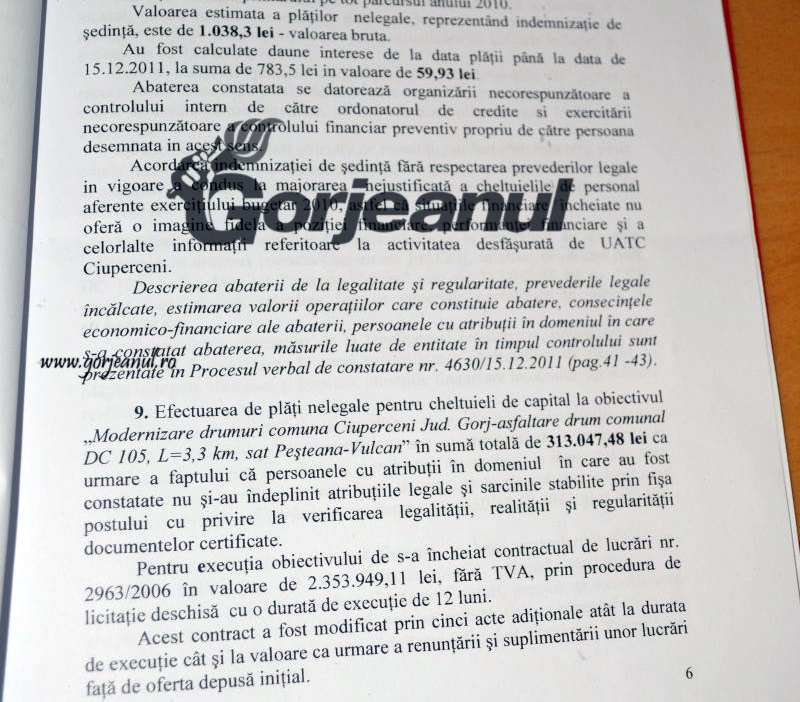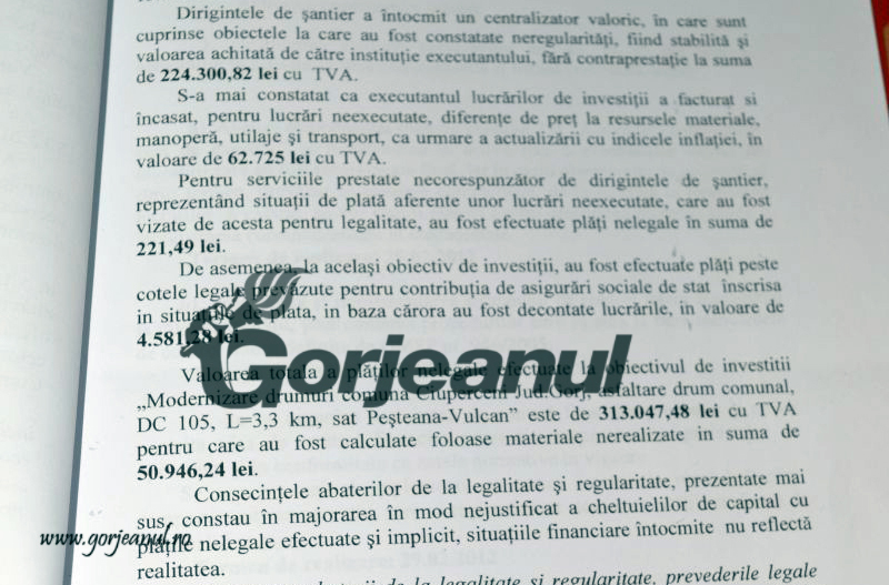 Tot legat de drumuri, obiectivul DC 105 Peșteana-Vulcan a beneficiat de plăți nelegale în sumă de 313.047 de lei, mai arată cei de la Curtea de Conturi care au cerut, în 2011, Primăriei Ciuperceni să rezolve problemele create bugetului și instituției publice.