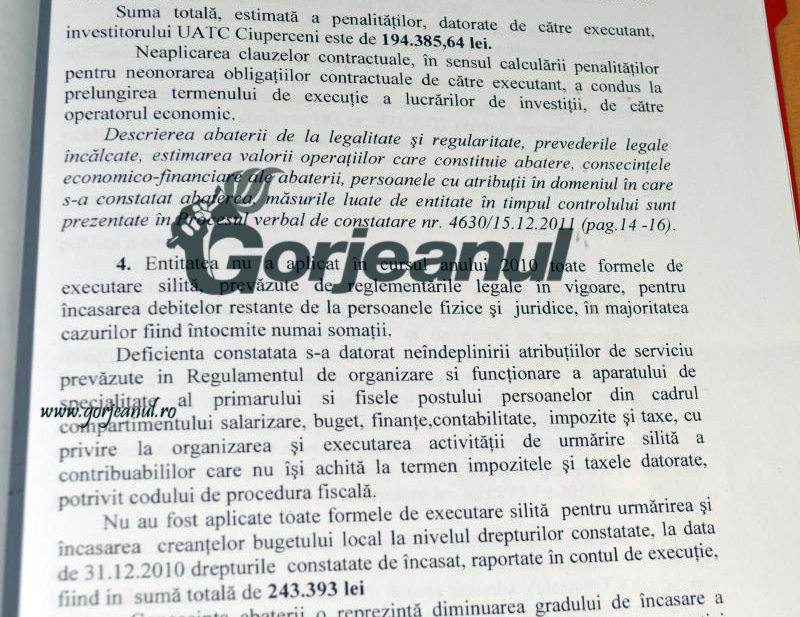 Primul mandat al edilului Tăloi în fruntea comunei Ciuperceni a fost, în schimb, unul dezastruos dacă punem în balanță raportul Curții de Conturi din decembrie 2011, realizat după o verificare minuțioasă a actelor financiar-contabile din această unitate administrativ teritorială.
